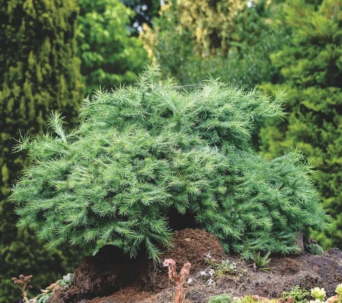 - Модрина японська «Блу дворф» (Blue Dwarf) — компактна карликова форма із синьо-блакитною хвоєю. Крона густа сферична. Як правило, буває у штамбовій формі. Висота до 1,5 метра.