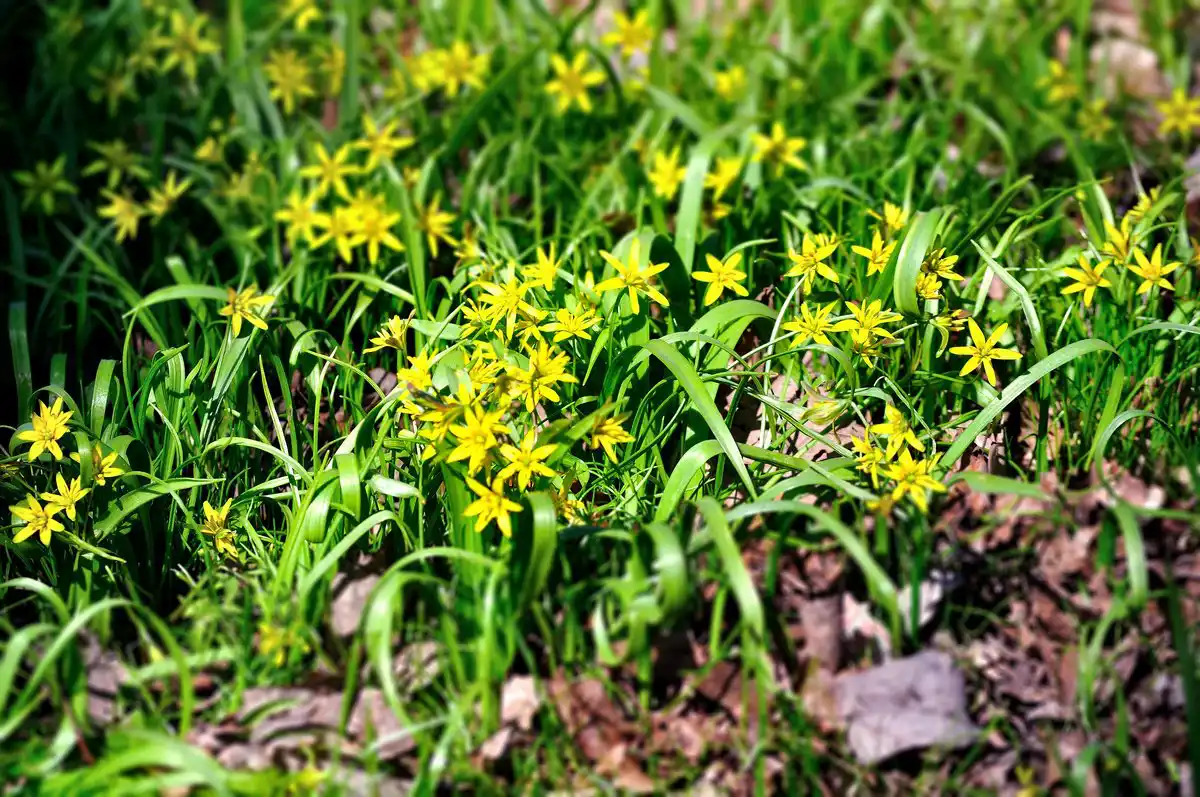 Як і інші види гусячої цибулі, жовтий (Gagea lutea) у природі майже непомітний, але в саду в рокаріях, бордюрах та на весняних галявинах він здається сліпуче сонячним.