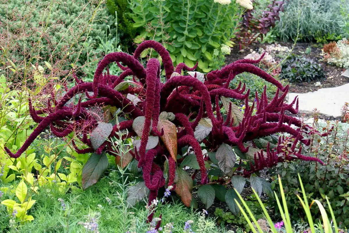 Амарант хвостатий (Amaranthus caudatus) зростом від 70 до 150 см з товстими звисаючими блідо-зеленими, червоно-бордовими, червоними суцвіттями. Є «бусоподібні» форми, суцвіття у яких зібрані в мутовки на стеблі. У продажу: "Каскад", "Ізумруд", "Натхнення", "Танець вогню", "Ялинкова іграшка", "Малинові намисто".