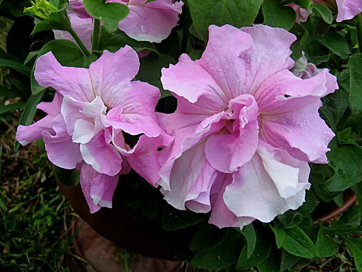 Петунія «Дабл Каскад Орхід Міст» (Double Cascade Orchid Mist) - Для мене найніжніша з махрових великоквіткових петуній. На одному кущі розпускаються дуже великі квітки, 10-13 см у діаметрі, різних відтінків рожевого: від практично білих до рожевих з легким фіолетовим відтінком. Причому таку гру відтінків можна спостерігати навіть у межах однієї квітки. У мене цей сорт викликає асоціацію з біло-рожевим зефіром або ніжною сукнею дівчинки-принцеси. Висота куща 15-25 см.