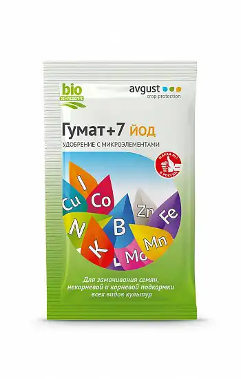 «Гумат +7 ЙОД». В основі добрива - солі (калієві і/або натрієві) гумінових кислот і мінеральні добавки (N, Zn, B, Mb, Fe, Cu, I). врожайність культур, покращує якість плодів, підвищує родючість ґрунту.