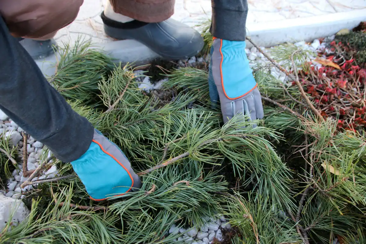 У перші два роки після посадки обов'язково потрібно укривати декоративні хвойні рослини, а в регіонах із морозними та сонячними зимами — навіть довше. Хвойні ховаються не так від морозу, як від сонця. Тому в даному випадку використовуються проникні «дихаючі» матеріали – мішковина, неткані покривні матеріали. Для дорослих рослин доречна сітка, що затіняє. Попередньо гілки рослин бажано зв'язати, притиснувши до стовбура, щоб їх сніг не поламав. Непогано спорудити курінь і вже його обтягувати матеріалом.