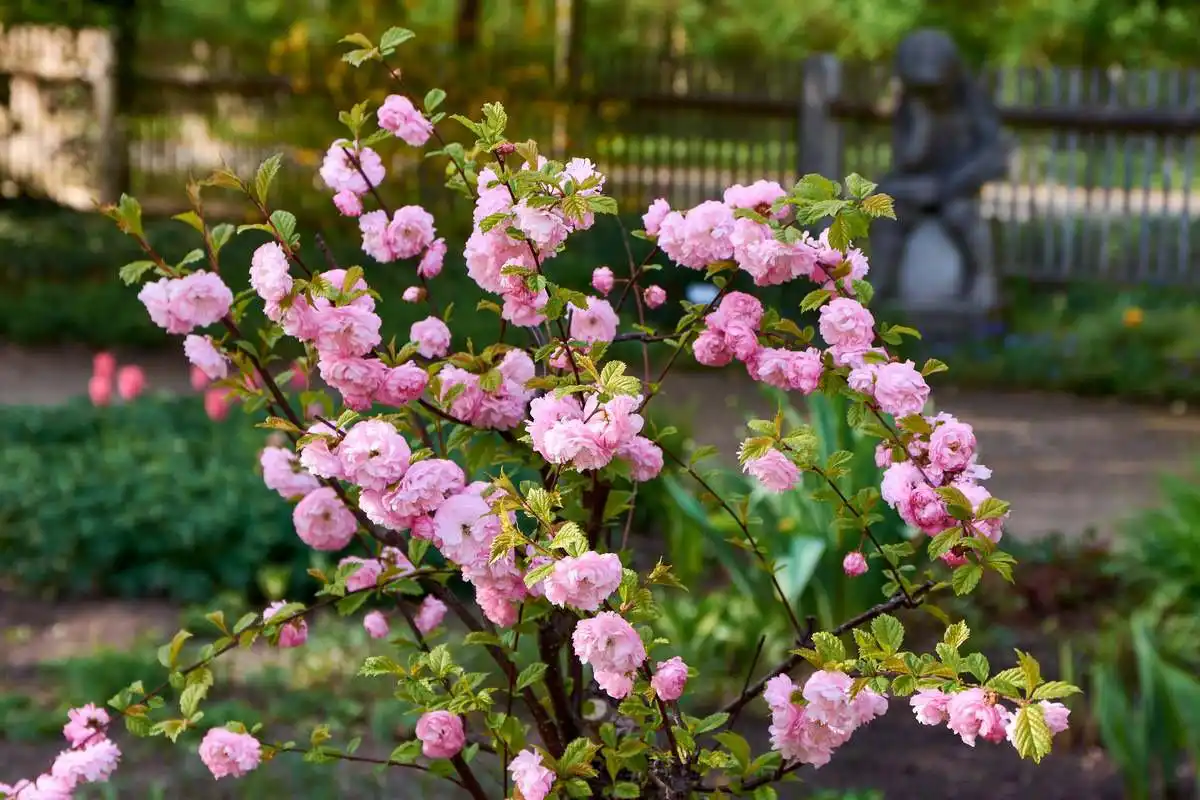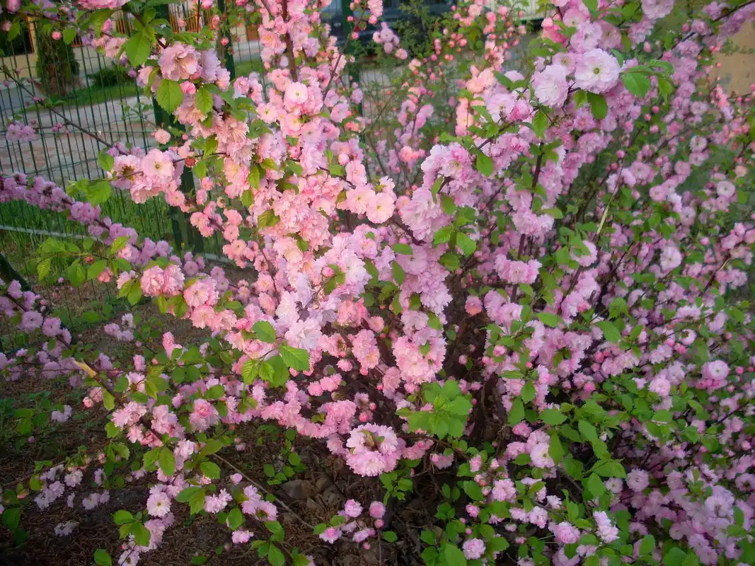 Мигдаль степовий, або низький (Prunus tenella) - Розкішний красивоквітучий чагарник з гладкими пагонами, витонченою розлогою кулястою кроною висотою всього до 1,5 м і ланцетним зубчастим листям, що починає розпускатися під час цвітіння. Квітки витончені, пазушні, до 2,5 см з п'ятьма подовжено-крапчастими пелюстками або махрові. Бутони яскраві, темно-рожеві. Рожева палітра забарвлень здається акварельною завдяки темному інтенсивному тону центру квітки.