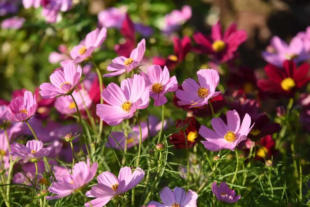 Космеї виблискують розсипом сліпучо чистих відтінків біло-червоної палітри. Білий, рожевий, пурпурний, вишневий у рідкісних видів змінюються жовто-оранжево-чорними варіаціями.