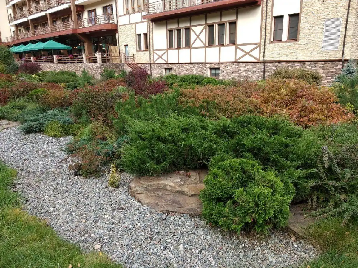 Цікаво виглядає покриття з каменю та кори. Камінь фіксує кути та стики геотекстилю, закриває частину поверхні. Кора заповнює інше. Це компроміс із погляду ціни: навіть простий плитняк не дешевий, зате він не псується і хвойні на його тлі виглядають гідно.