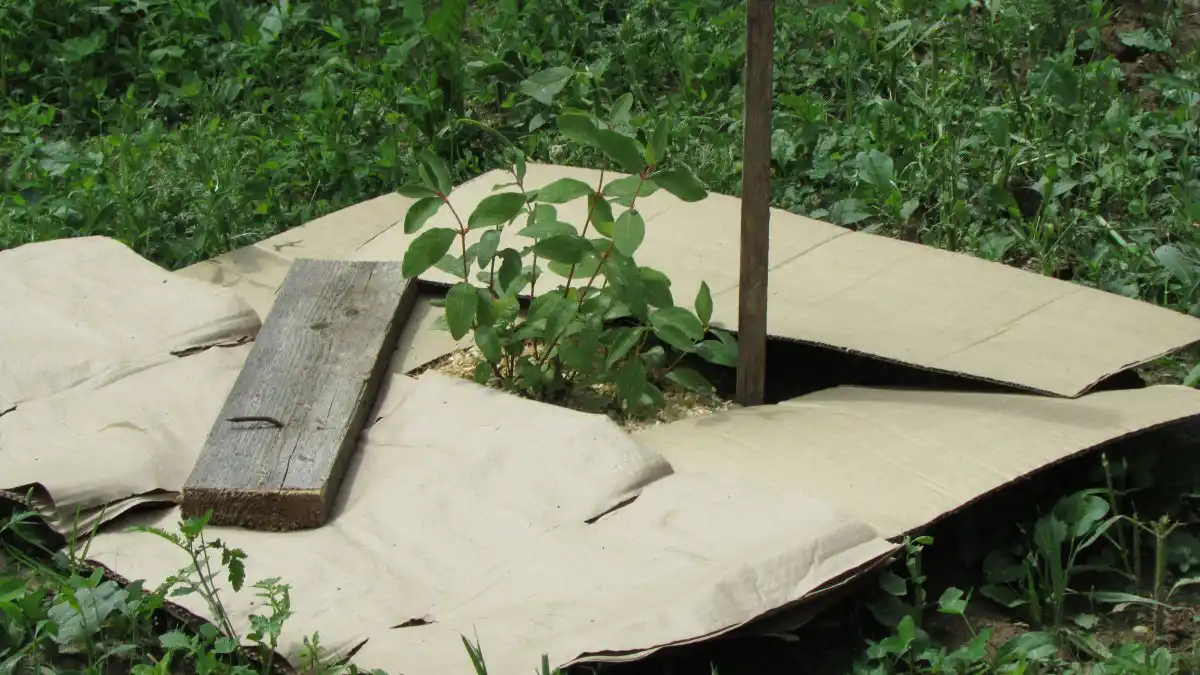 Рожеводи знають старий і дешевий метод мульчування: розкласти під кущами мокрі газети товстим шаром. Це точно стримує зростання трав і не заважає троянд, проте вигляд такого розарію не всім припаде до смаку. Для мульчування плодових дерев ми використовуємо картон, розкладки пакувальних ящиків. Це міцний матеріал, витримує дощі, при необхідності по ньому можна ходити. Трава через нього не пробивається, але треба уникати найменших щілин, повністю блокувати світло. Наприкінці сезону під картоном опиняється чиста і досить пухка земля. Два явні «мінуси»: непрезентабельний вигляд і необхідність ретельно придавити всі краї листів, інакше їх розкидає вітер. Ми робимо це старими дошками. Вигляд абсолютно «сільськогосподарський», проте розклав один раз – і більше жодних турбот.