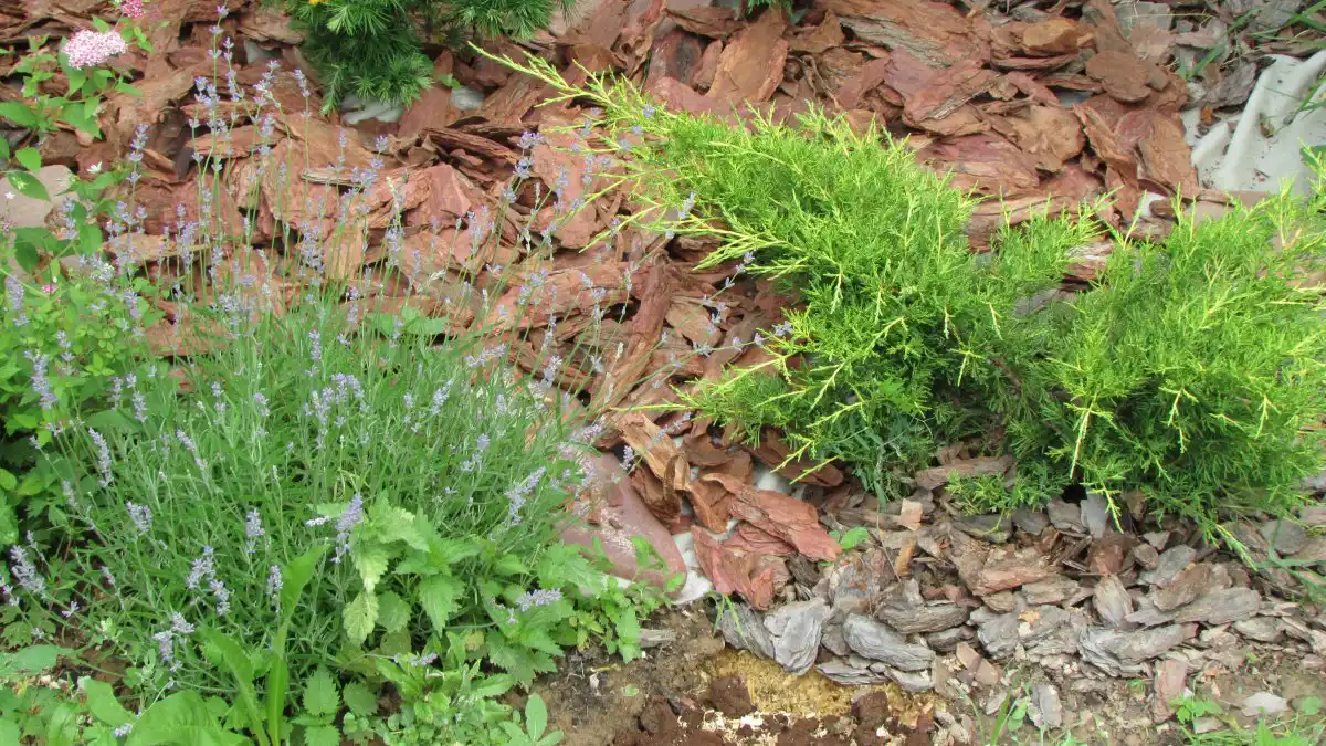 Використовували для мульчування кору сосни та модрини. Дуже гарне рішення для хвойних. Однак, щоб запобігти проростанню бур'янів, необхідно разом з корою використовувати геотекстиль, причому щільністю вище 200 г/кв. м. Бажано, щоб він був темним, тоді буде потрібно менше кори для створення рівного та приємного оку покриття. Без геотекстилю полоть доведеться майже без кори. При косьбі газонокосаркою поруч із покриттям з кори її може частково здувати, якщо використовується триммер.