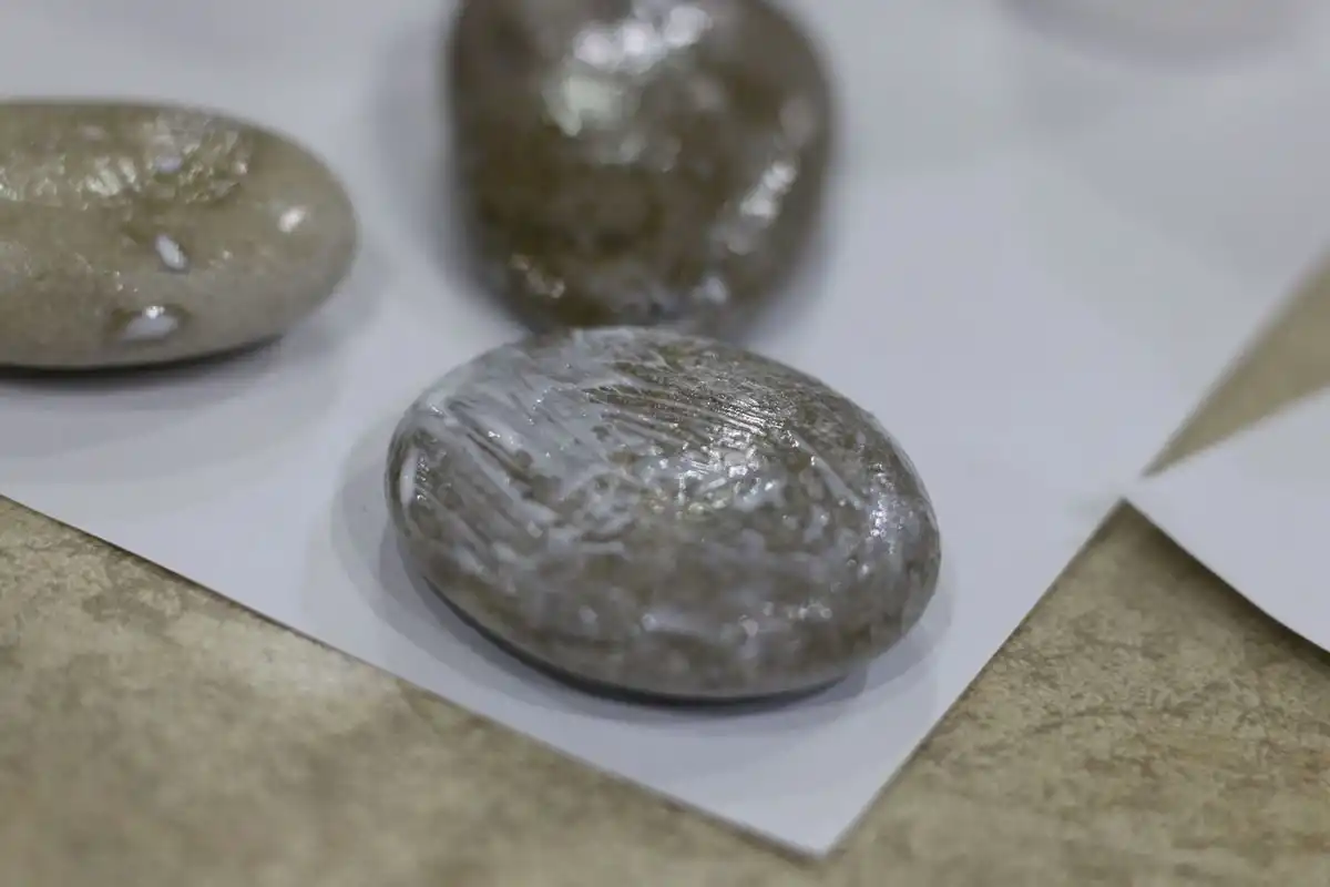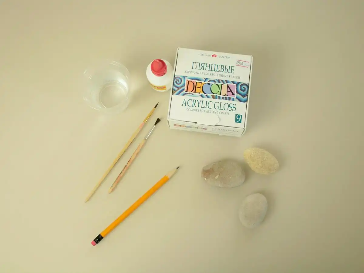 Якщо є потреба, відмиваємо каміння від землі, обтираємо, щоб видалити з них пісок. Просушуємо. Беремо товсту натуральну кисть і наносимо на верхню поверхню камінчик клей ПВА. Відкладаємо камінь убік до повного висихання. Пензель відразу відмиваємо від клею і ставимо просихати. Цей крок необхідний для того, щоб згладити дрібні ямки та тріщини на поверхні гальки, а значить спростити роботу з нанесення фарб.