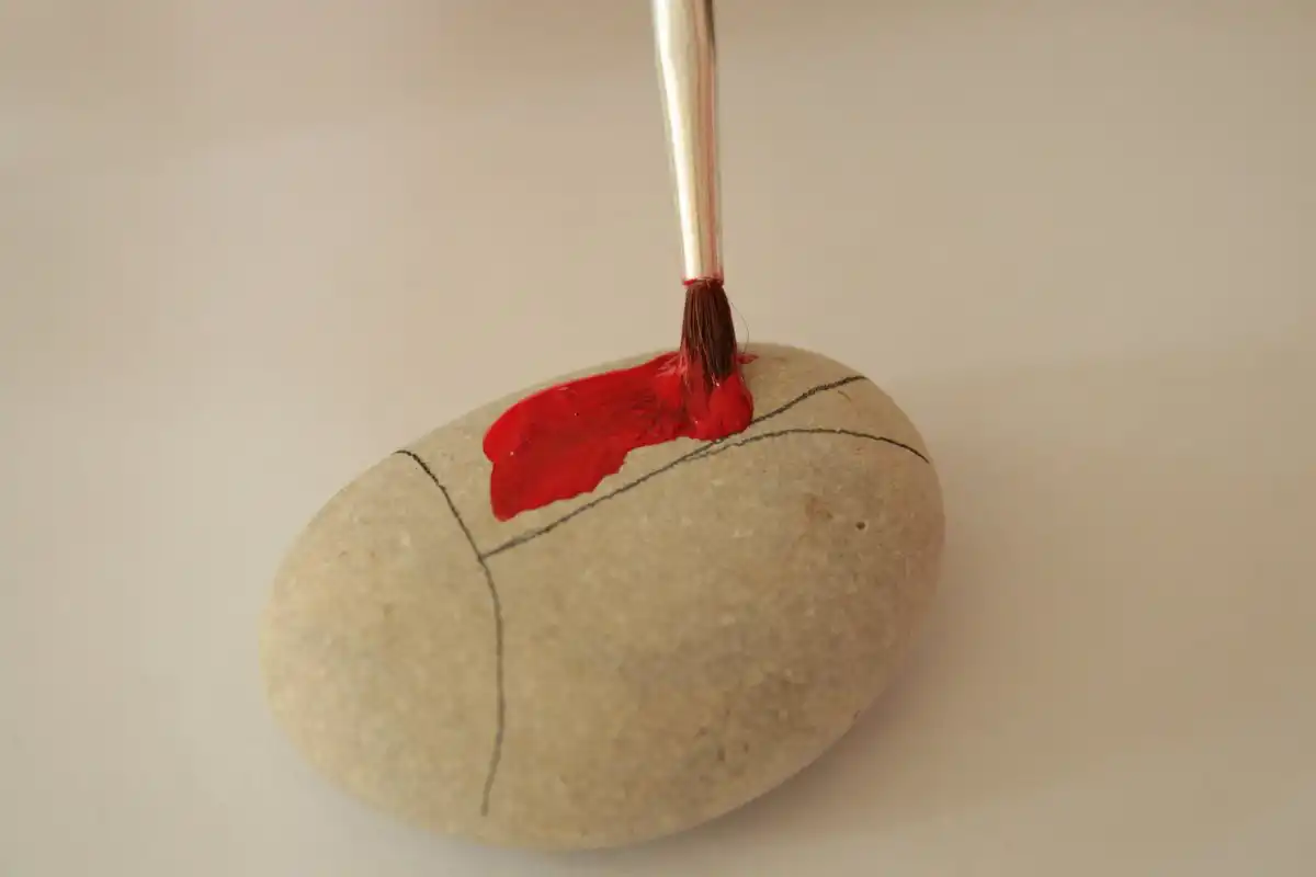 Зафарбовуємо найбільші деталі - червоні надкрила (можна жовті, рожеві, блакитні, помаранчеві, зелені, фіолетові - дивлячись яка у вас сонечко). Мазки краще наносити в одному напрямку, щоб фарба лягла рівномірно. Намагаємося покрити кольором не лише «спинку» камінчика, а й боки, щоб потім при погляді збоку не проглядали незабарвлені поверхні. Даємо фарбі висохнути.