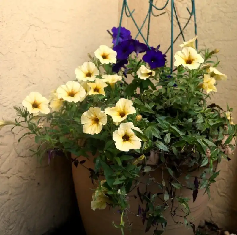 Сусідами традесканції стали ампельна петунія та кохія (літній кипарис) у центрі композиції. Гібазис на подив швидко зростав і незабаром буквально на очах перетворився на дуже пишний кущик, покрив більшу частину поверхні діжки і міг навіть змагатися з потужною батогом.