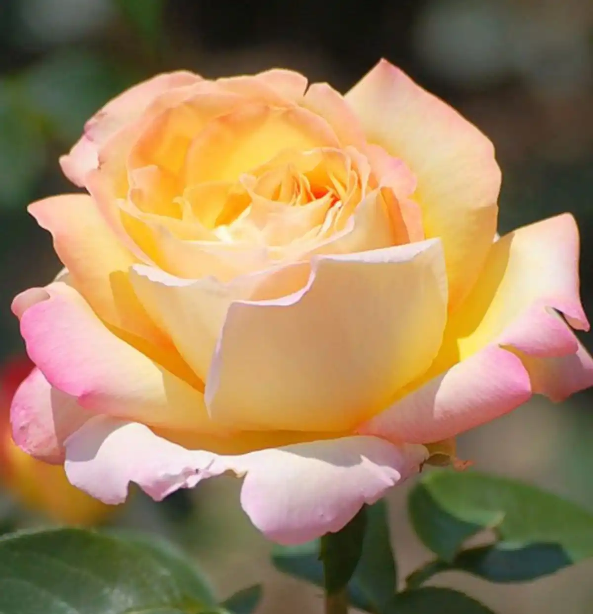 Двоколірна троянда з високим бокаловидним бутоном і незвичайним забарвленням витончено відігнутих пелюсток: червоних з внутрішньої сторони, із зовнішньої – кремових, квітка (10-12 см) з ніжним ароматом радуватиме рясним цвітінням до перших морозів.