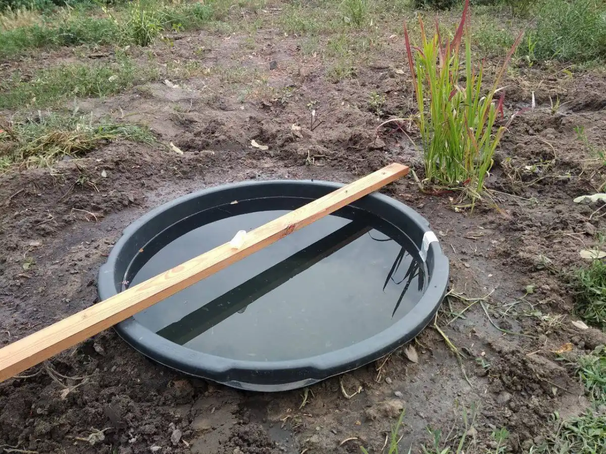 Сильно заглиблювати ємність у землю не варто, адже невисокий борт по краю не вбереже від затікання землі під час дощів або танення снігу. Тому вкопуємо, трохи піднявши над рівнем ґрунту. Бажано, щоб дно ємності поступово по всій своїй площі спиралося на земляну подушку.