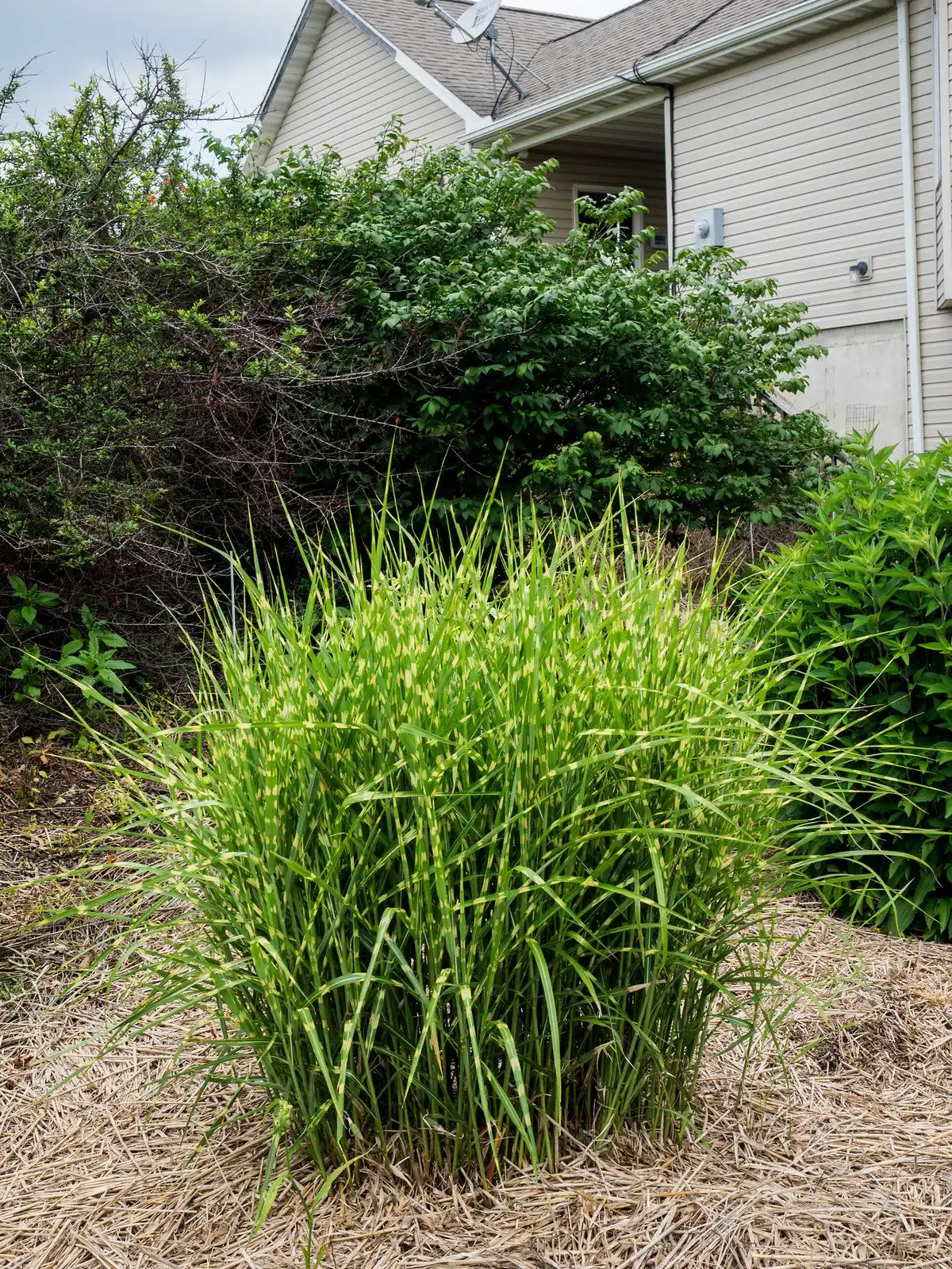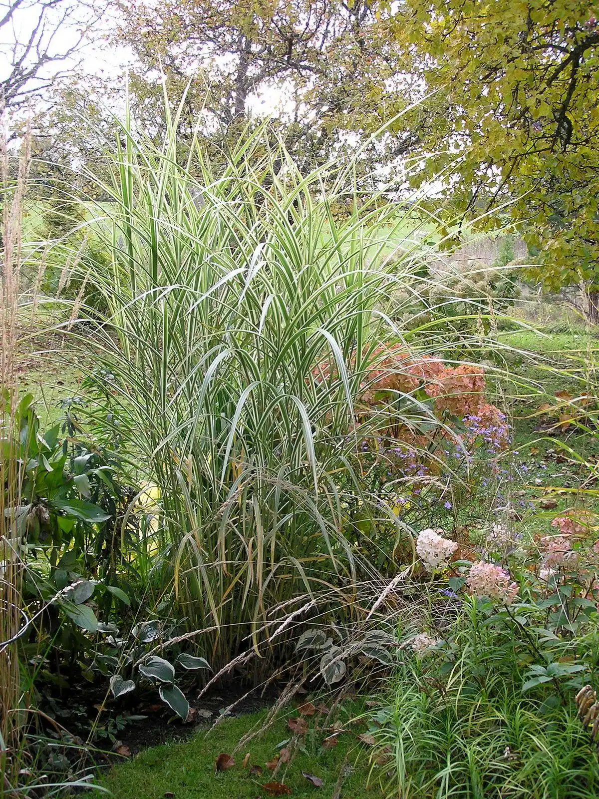 - міскантусу цукроцвітого: досягають 2,5 м сорту‘Zebrinus’ з кремовими горизонтальними смужками, ‘Strictus’ з білими штрихами на листі і червоні волоті, ‘Grosse Fontane’ з дуже щільним «хутряним» кущем;