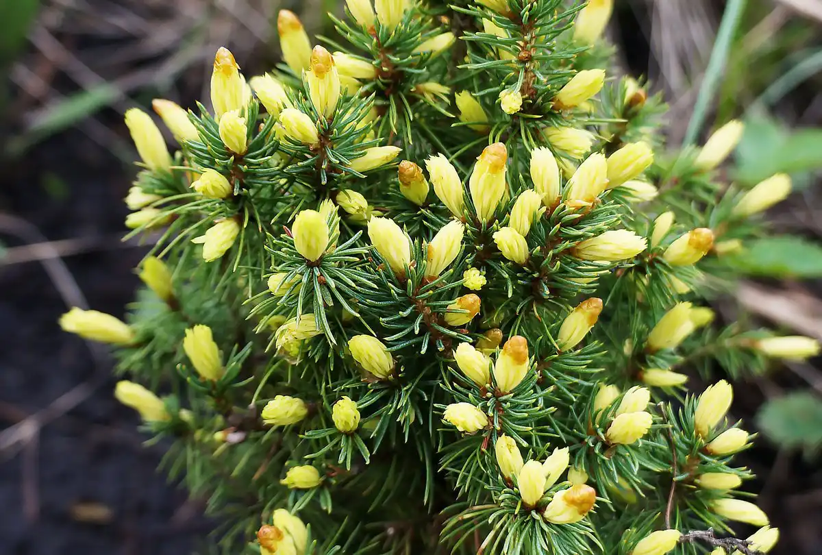 У цей період молоді бруньки хвойних тільки починають розпускатися і виглядають точно чарівні бутончики. Особливо ошатні на початку травня сорти з контрастним яскравим приростом. Наприклад, у їли канадською «Рейнбоус енд» і «Дейзієс вайт» молоді пагони жовті. Подібні сорти можна знайти і у блакитна ялина колюча. Зокрема, золотисті молоді хвоїнки на тлі звичних блакитних голок мають ялина «Майгольд» і «Біалобок».