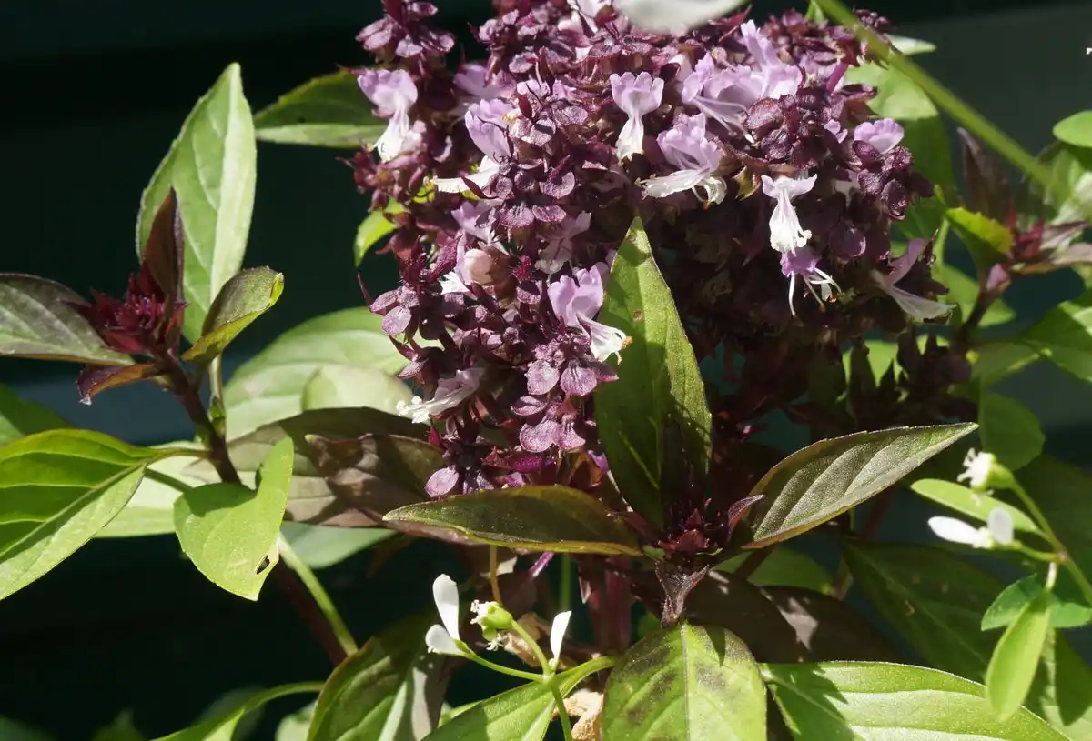 Якщо дозволити базиліку зацвісти, то над його виразним пурпуровим листям підніматимуться стрункі колосоподібні суцвіття з ліловими квітками, що контрастують з темними стеблами і листям. Такий базилік чудово впорається з роллю вертикального акценту в квітниках та балконних композиціях, і особливо органічний у міксбордерах природного стилю або чайних садках з іншими пряними травами.