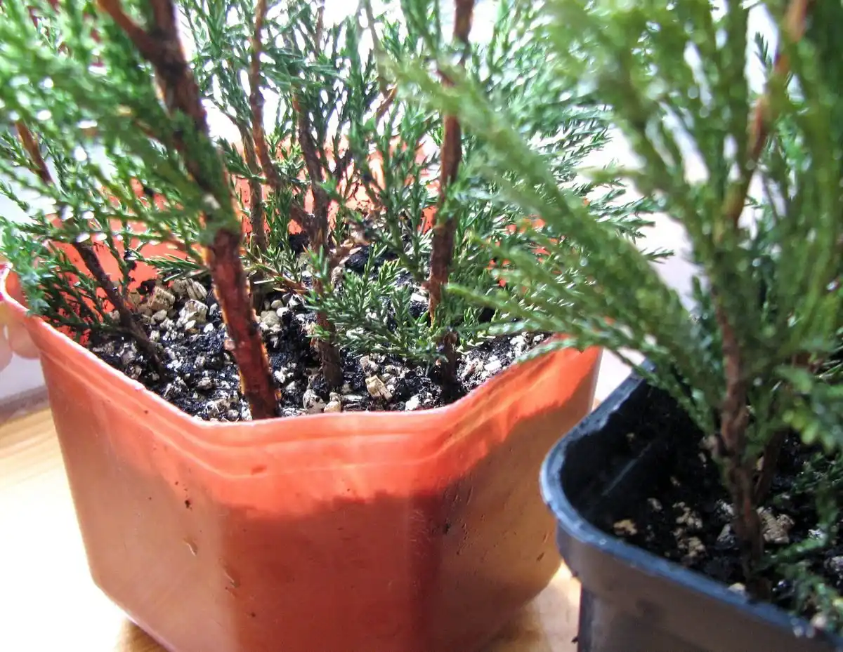 Раніше наступної осені робити це не варто. Коріння утворилися, але вони настільки маленькі та вразливі, що краще їм створити комфортніші умови. Якщо вкорінювали живці в загальній ємності, то через 3-4 місяці дуже акуратно розсадіть їх по окремих контейнерах з вже повноцінною ґрунтовою сумішшю для хвойних - або покупної, або власного виробництва.