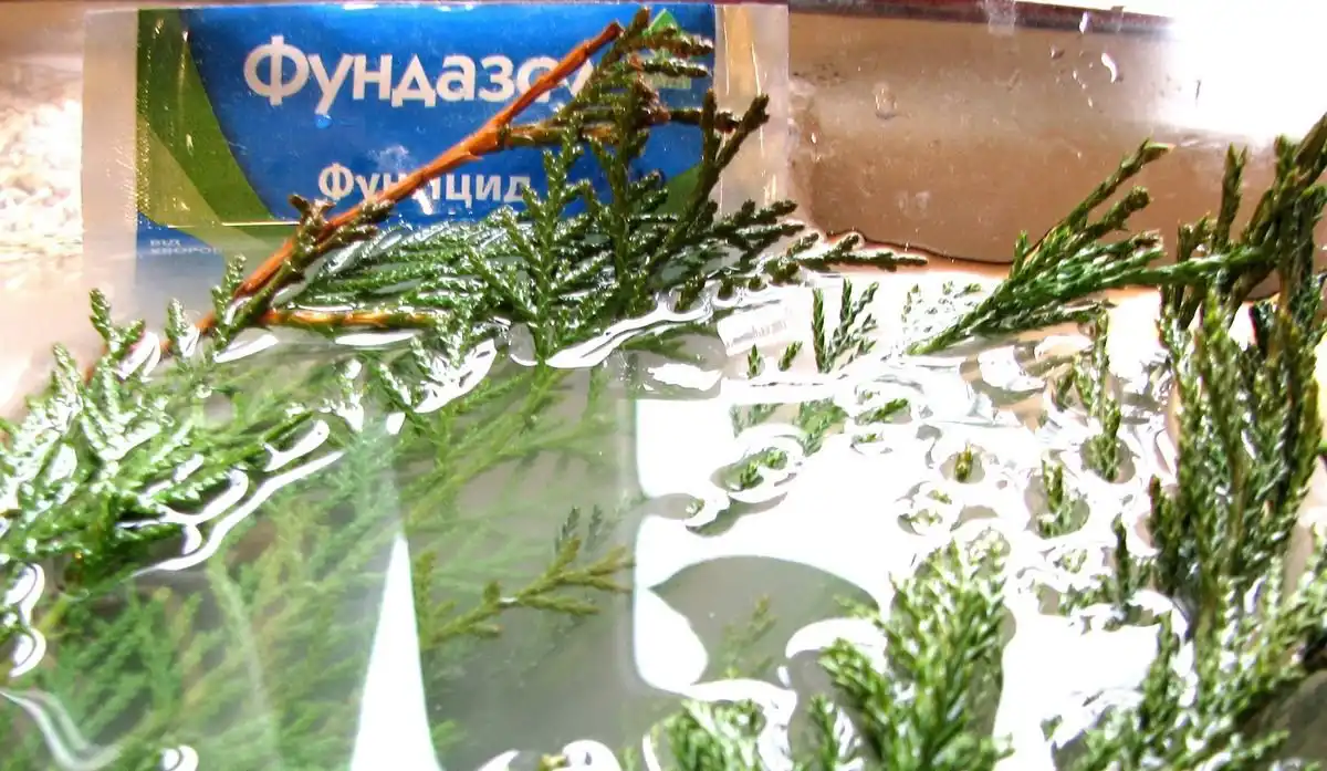 Дуже часто живці хвойних рослин не вкорінюються не тому, що висихають, а тому, що уражаються хворобами, суперечки яких неминуче на них присутні. Тому наступний важливий етап — провести дезінфекцію черешка, для чого його занурюють у розчин фунгіциду, наприклад, «Фундазолу». Це не просто короткочасне занурення, а занурення в розчин на кілька хвилин, щоб препарат проник у внутрішні судини черешка (цей препарат системний).
