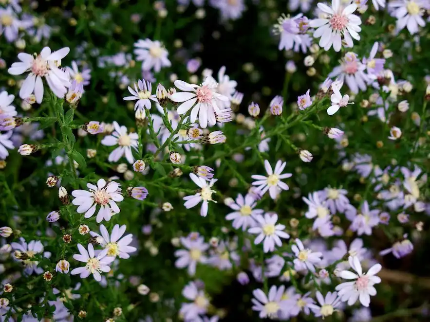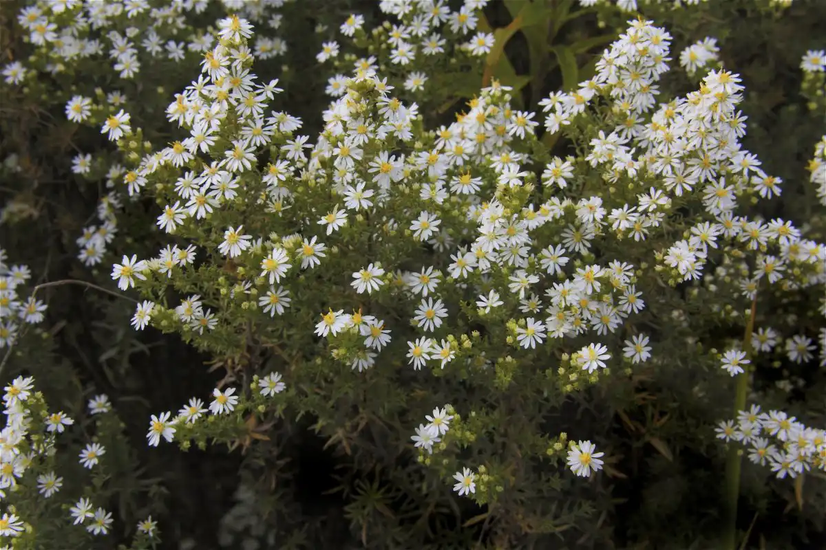 - Симфіотрихум розчепірений, або Астра розчепірена (синонім - симфіотрихум щиткоподібний, Symphyotrichum divaricatum) – компактний, але дуже ефектний вид симфіотрихумів. Ця рослина підкорює мереживними текстурами. При висоті до 75 см кущики дуже розлогі, густі, а дрібне овальне листя на довгих черешках надає рослині ефекту зеленого мережива.