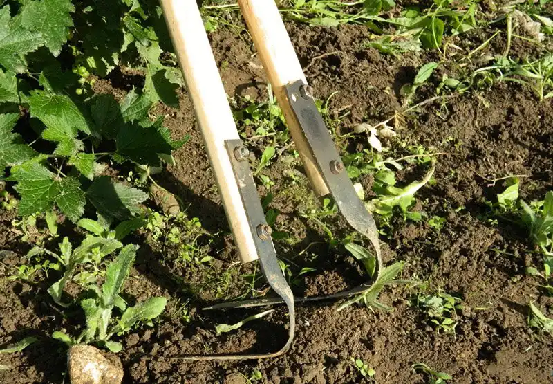 При підгортанні городніх культур плоскорізом Фокіна пряма спина відпочиває, але руки виконують більше рухів, підгортаючи землю під кущі.
