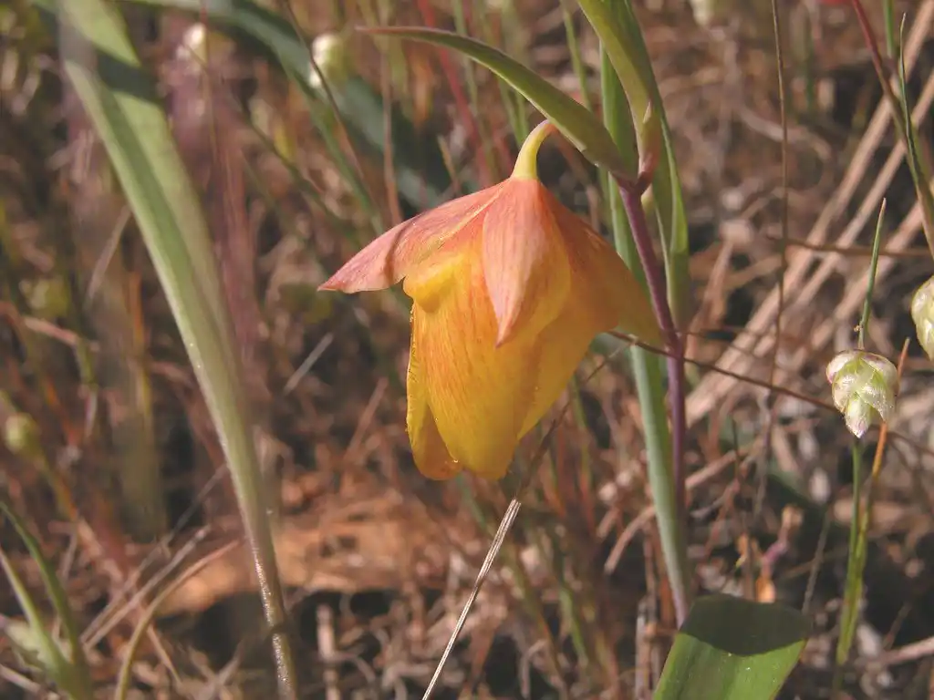 Калохортус приємний (Calochortus amabilis), Golden Fairy Lantern, Diogene's Lantern – гарний вид з півметровим плоским листям і вильчатим стеблом, на якому сидять кулясті, нікчемні ліхтарики квіток із золотаво-зеленими чашолистками та золотими пелюстками, прикрашеними коричневою плямою біля основи та дрібною бахромою по краях.