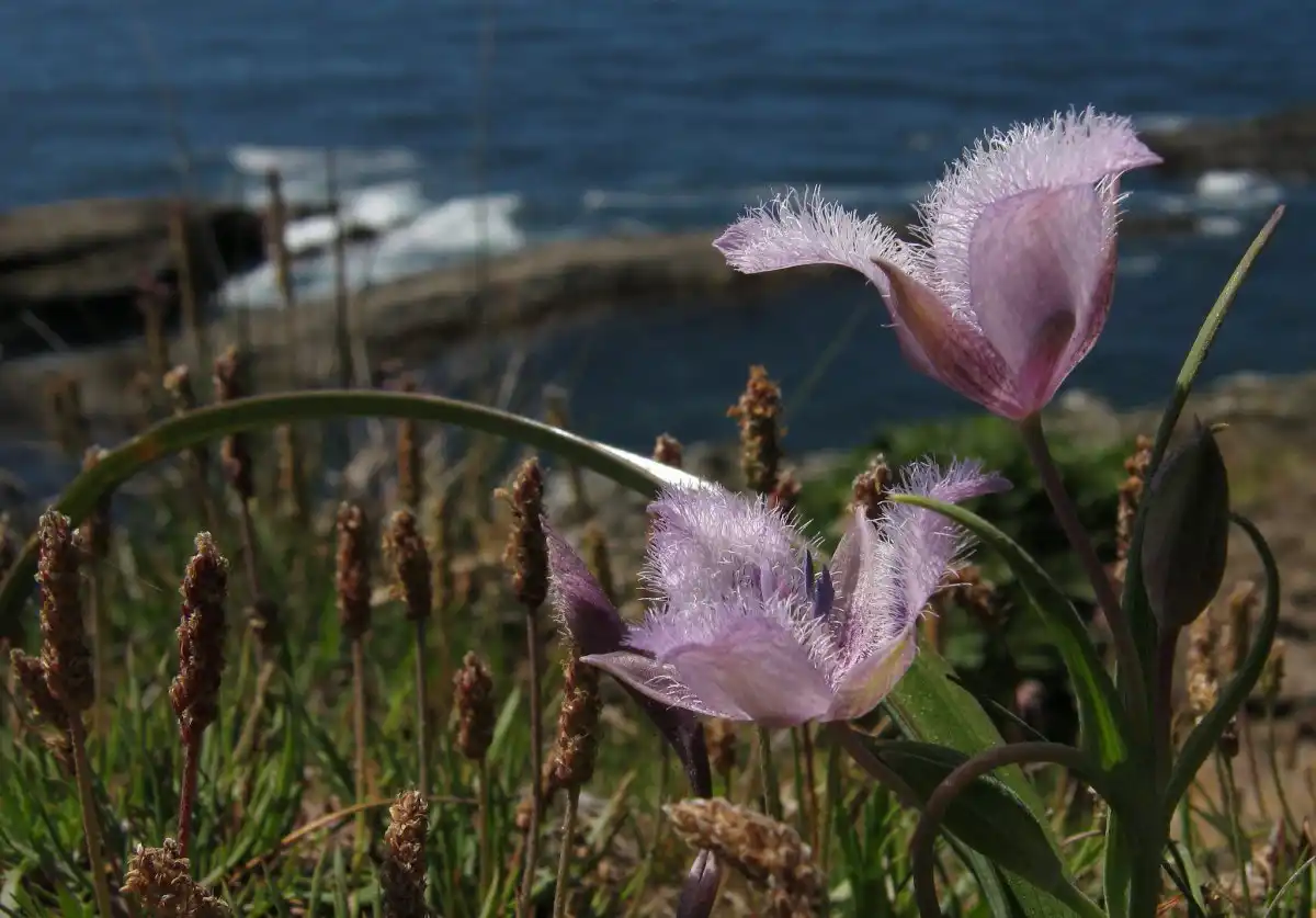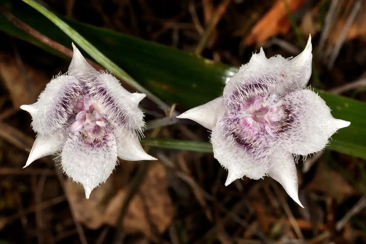 Калохортус Толмі (Calochortus tolmiei), Blue Cat's Ear, Blue Star Tulip - Низькорослий і дуже строкатий вигляд. При висоті квітконосів близько 20 см рослина випускає більш широке, яскраво-забарвлене, але нечисленне листя і разюче великі трипелюсткові квітки, що дивують не тільки темно-сірим зівом на білому тлі, але і вражаючою густою волохатістю.