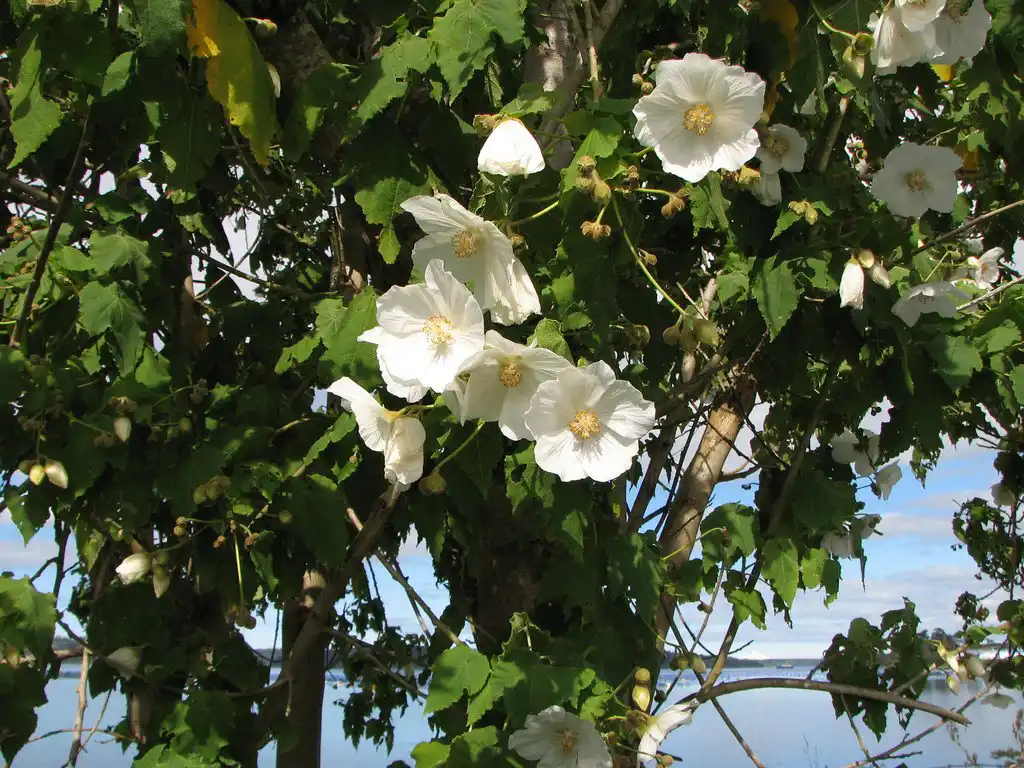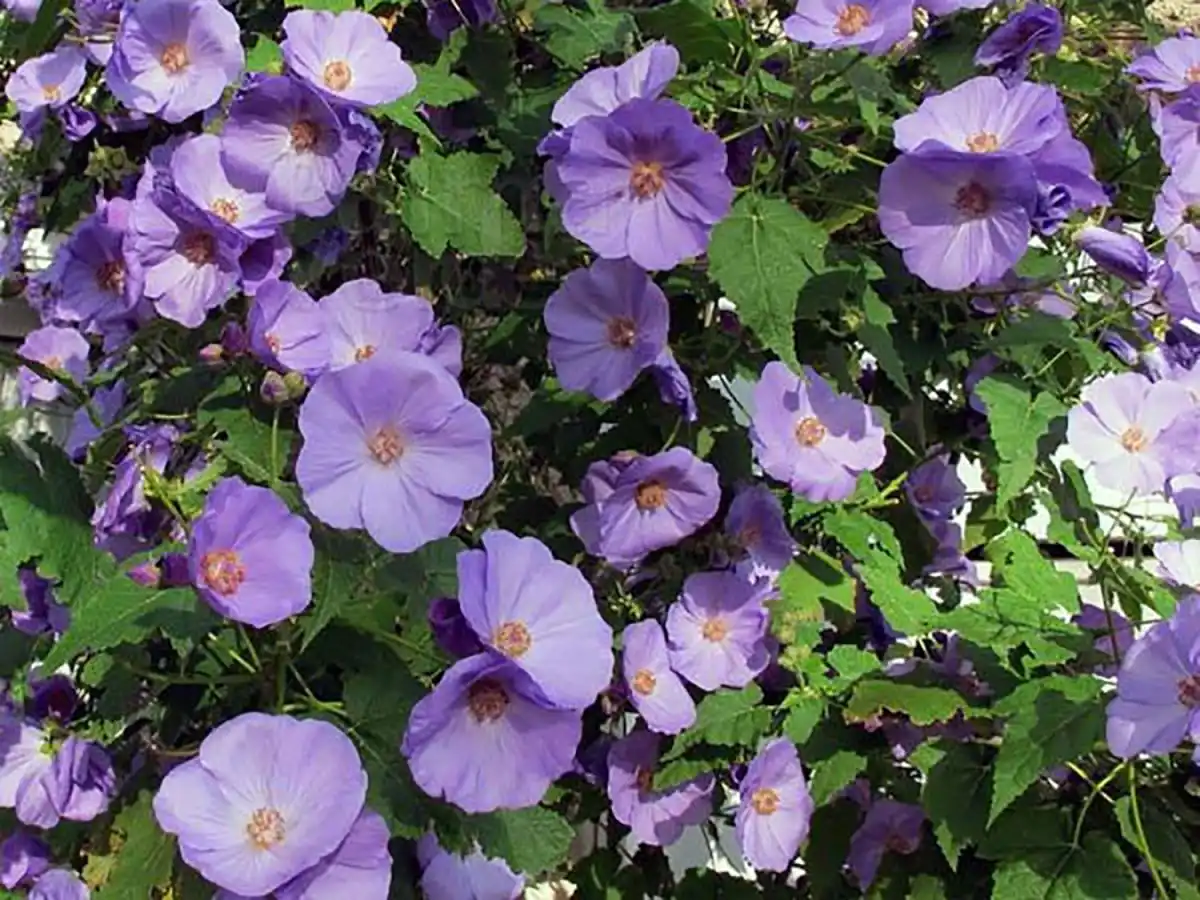 - Канатник винограднолистий або овечий (Corynabutilon vitifolium) – чудовий потужний листопадний чагарник, що з віком у сприятливих умовах перетворюється на дерево. Максимальна висота в природі не обмежена 5 м, але в садовій культурі рослини не перевищать і 2 м. Діаметр кущиків майже вдвічі поступається висоті завдяки своїй акуратній формі. Пагони потужні, повстяні, зелені, формують гарну струнку крону. Лопатеве овальне листя прикрашене приємною сірою галявиною і зубчастим краєм, в довжину вони досягають 15 см і дуже нагадують опушене листя винограду. Чашоподібні квітки діаметром до 8 см зібрані в рідкі кисті суцвіть. Колірна гама обмежена білим, рожевим та бузковим забарвленням. Зацвітає винограднолистий садовий абутилон у травні, тішить своїм цвітінням трохи більше місяця.