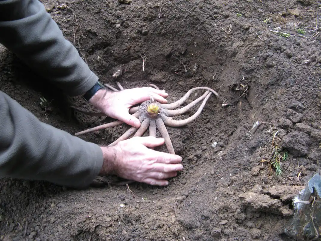 Рослини розміщують в індивідуальних посадкових ямках шириною і глибиною близько 15 см. При поводженні з корнедонцями потрібно стежити за тим, щоб не обламувалися і не пошкоджувалися навіть дрібні коріння, а самі корені рівномірно розподілилися по периметру посадкової ямки. Корнедонця встановлюють рівно, укладаючи на земляний горбок так, щоб нирки знаходилися на заглибленні в 5-7 см. Якщо посадку проводять не на альпінаріях, то краще укладати коренедонця на пісок і присипати їм рослини зверху. Ґрунт насипають і утрамбовують акуратно, намагаючись заповнити порожнечі, але не пошкодити коріння та нирки.