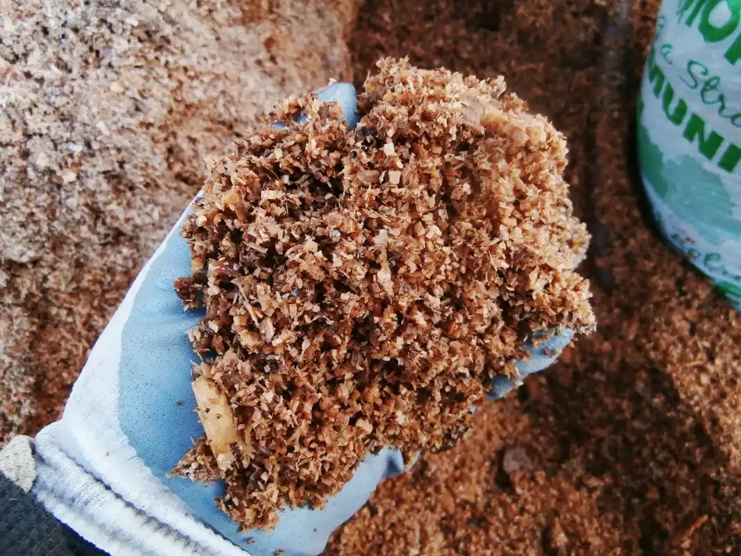 - Для підготовки тирси-органічного компосту необхідний курячий послід або гній. У тирсу органіку додають з розрахунку 1:1 (за вагою) і для ферментації змішують з тирсою або укладають шарами. Протягом ферментації аерують купу вилами (пушать).