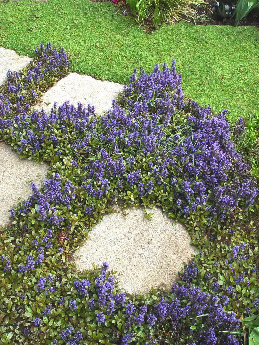 Живучка повзуча, або повзуча аюга (Ajuga reptans) у нас часто сприймається як бур'ян, хоча найкращі сорти цієї ґрунтопокривної рослини, зокрема, легендарний сорт “Chocolate Chip”, є одними з найвитриваліших багаторічних кандидатів для створення привабливих майданчиків у затінених місцях. Аюги не втрачають декоративності довгі роки одному місці і не виростають. Темне листя з шоколадним, пурпуровим або бронзовим відливом досить ніжне, воно зібране в прикореневі розетки. Пагони стелиться і вкорінюються у вузлах. Темно-сині або блакитні суцвіття мутівки ще більше підкреслюють відмінності в забарвленнях рослини від навколишніх багаторічників. Аюгу краще використовувати для заповнення великих проміжків у крокових стежках, у комбінованому мощенні доріжок та майданчиків. Вона винесе і сонце, і повну тінь, росте у будь-яких ґрунтах. Догляд за нею зводиться до поливу у дуже сильну посуху.