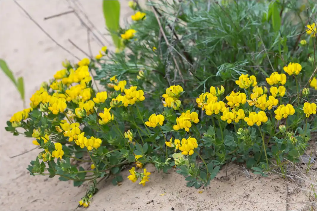 Лядвенець рогатий (Lotus corniculatus) - Один з найефектніших грунтопокровників. Створює кучеряве, мереживне, вражаюче щільне покриття. Пагони довжиною до 60 см лежать чи піднімаються, формуючи сплутаний килим. Лядвенець здатний розкрити свою красу навіть на дуже великих площах і найнесприятливіших умовах. Це сонцелюбний грунтопокровник, у якого пальчасте, інтенсивно зелене листя поєднується з яскраво-жовтими напівмахровими квітами. Крім функції зміцнення ґрунту, лядвенець їх ще й покращує, граючи роль сидерату. За бажання отримати більш щільне та рівне покриття, килимок можна косити.