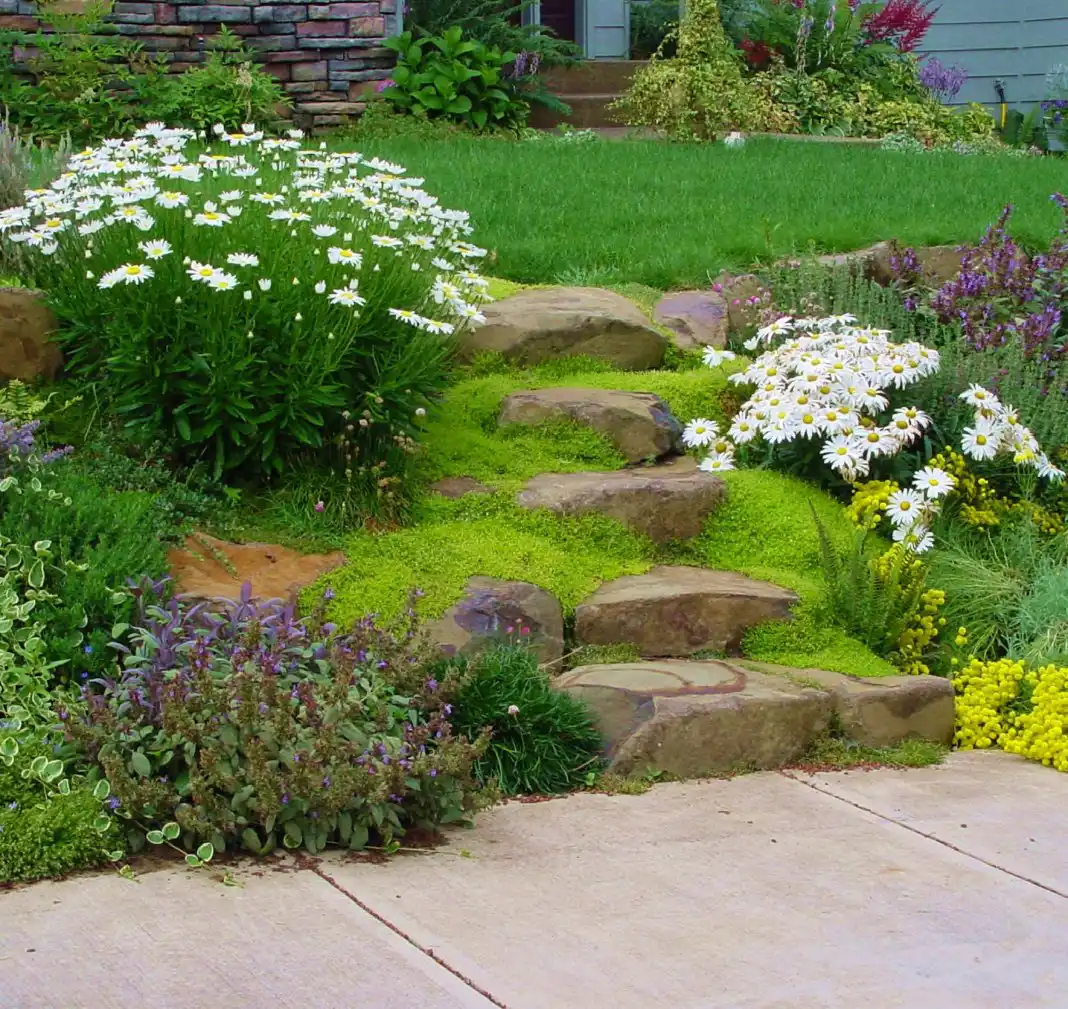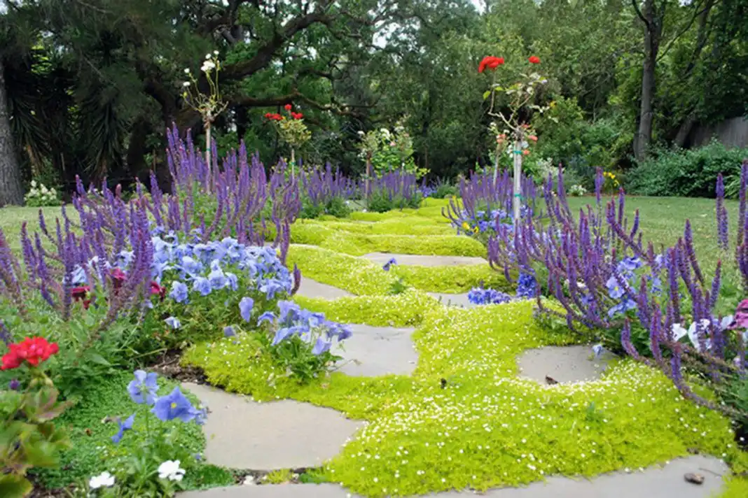 В оформленні доріжок, майданчиків, стежок з великим навантаженням (до витоптування) зовсім не обов'язково обмежуватися лише натуральними або штучними матеріалами та звичайними методами укладання, відсипання та мощення. Придатне для ходьби та оригінальне покриття можна створити і з рослин. Дивовижні ґрунтопокровники та мохи — чудова альтернатива не лише газонам. Вони допоможуть заповнити порожнечі та прогалини, щілини між камінням та плитами, приховають недоліки старих покриттів та додадуть саду природного шарму.