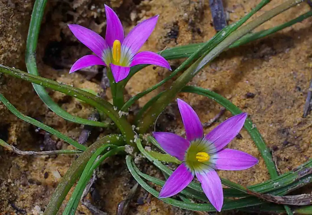 Ромулея рожева (Romulea rosea) – один із найкрасивіших первоцвітів. Поодинокі, лійчасті, широко відкриті квітки відрізняються бездоганною симетрією звужених на кінцях широких яйцеподібних часток і темною позіхою. Забарвлення красномовно свідчить про назву - рожево-лілове, воно дуже яскраве і яскраве.