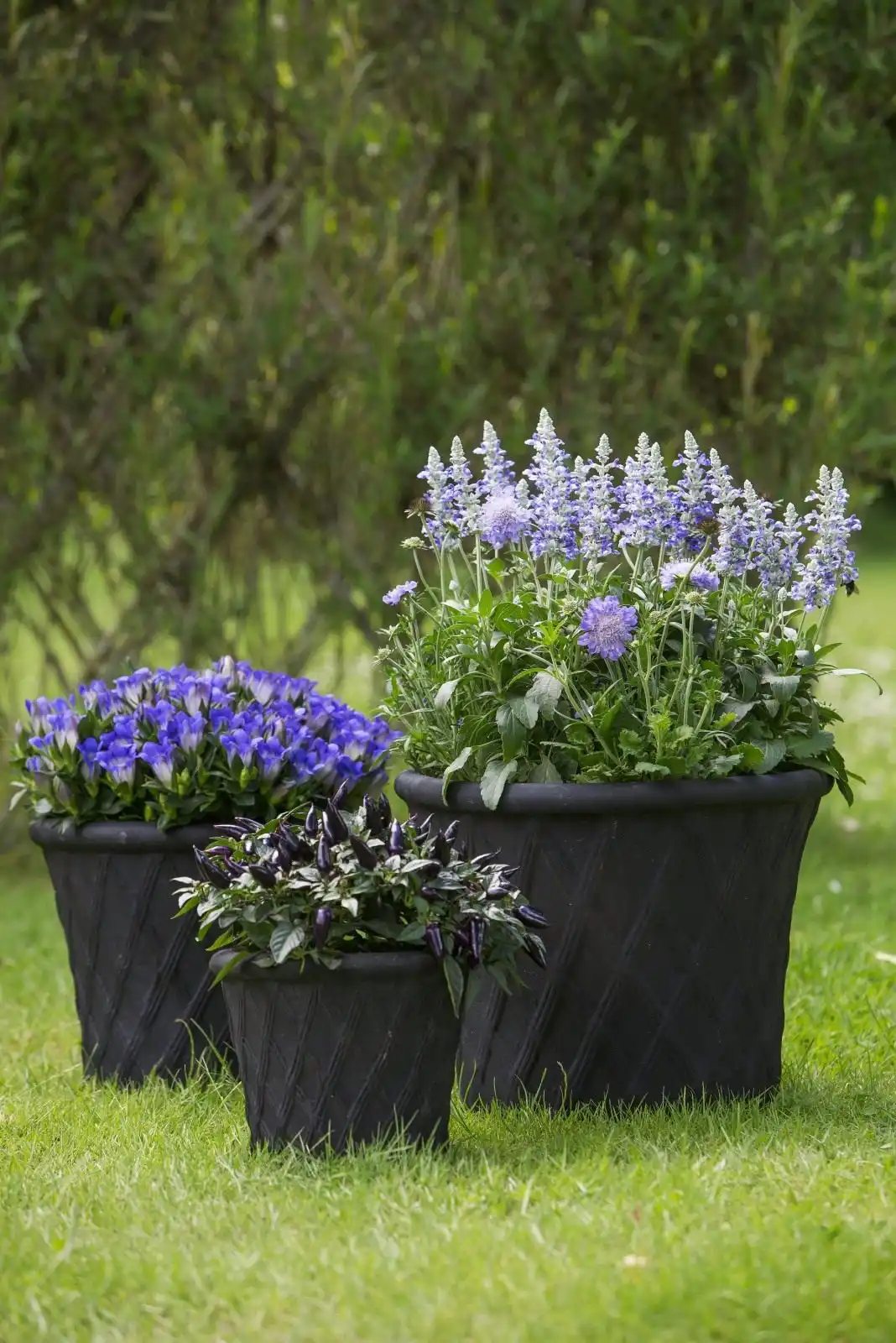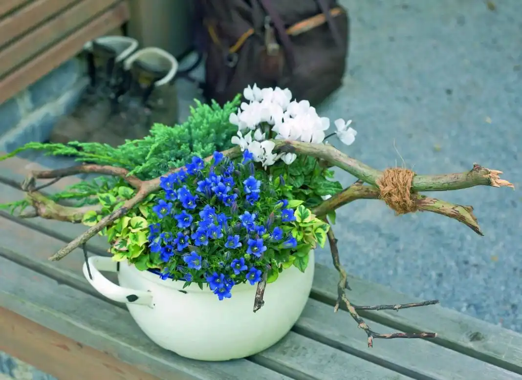 Якщо ви хочете створити з тирличами переносний квітник, композицію в горщику, то для контейнера вибирайте партнерів не лише за схожістю вимог, а й за принципом розмаїття форм. Так, лідер горщикових композицій - гібрид Тісто шорсткої і семироздільні (Gentiana scabra x Gentiana septemfida, також відома як Gentiana x septemscabra).