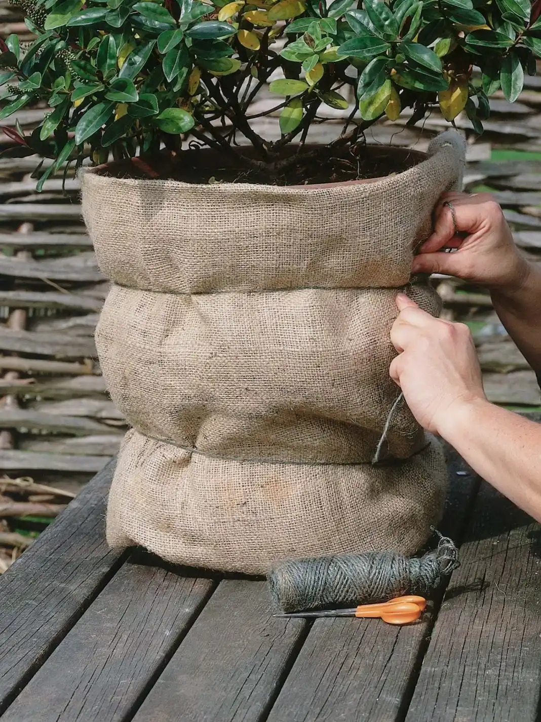 - горщики завжди можна обернути теплим джутом, мішковиною, старою ковдрою клаптиків, комбінацією теплих тканин і нетканого матеріалу, простою пухирчастою плівкою.