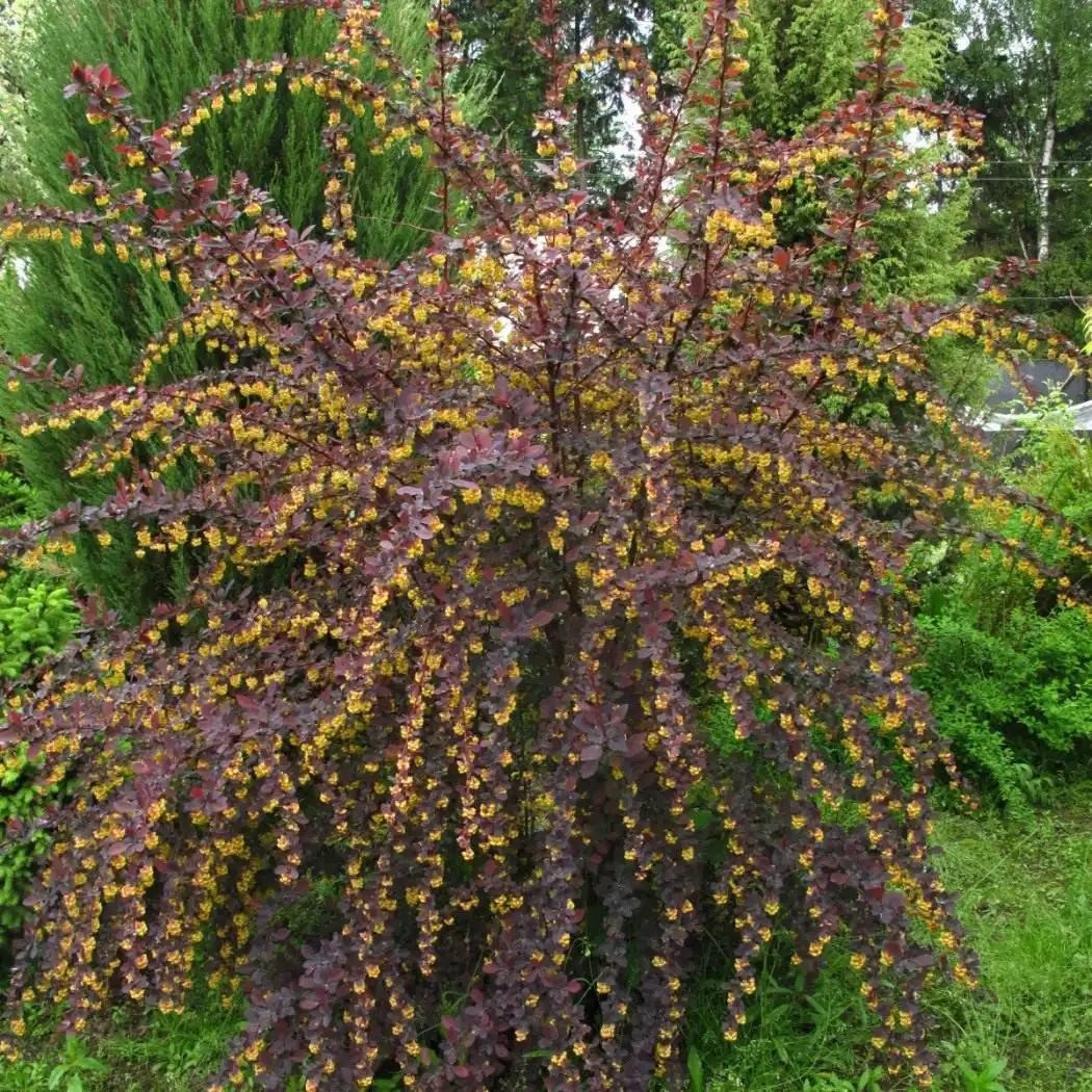 Для садово-паркового декору підійде Барбарис Тунберга (Berberis thunbergii). Вирізняється високо декоративними дугоподібними, ребристими багряно-червоними пагонами, за що його часто використовують у формуванні живоплоту на дачах та прибудинкових ділянках південних регіонів. Пагони вкриті гнучкими колючками. Барбарис Турнберга погано переносить морози. Висота чагарників становить від 0,5 до 1,5 м і чудово прикрашає двір або сад, надаючи індивідуальності декоративним групам та солітерним посадкам незвичайним кольором листя – яскраво-зеленого літа, а восени вогненно-червоних відтінків. 2-3 невеликі кисті неїстівних, але лікувальних плодів червоного кольору розташовуються в пазухах листя. Дозрівають ягоди у вересні-жовтні.
