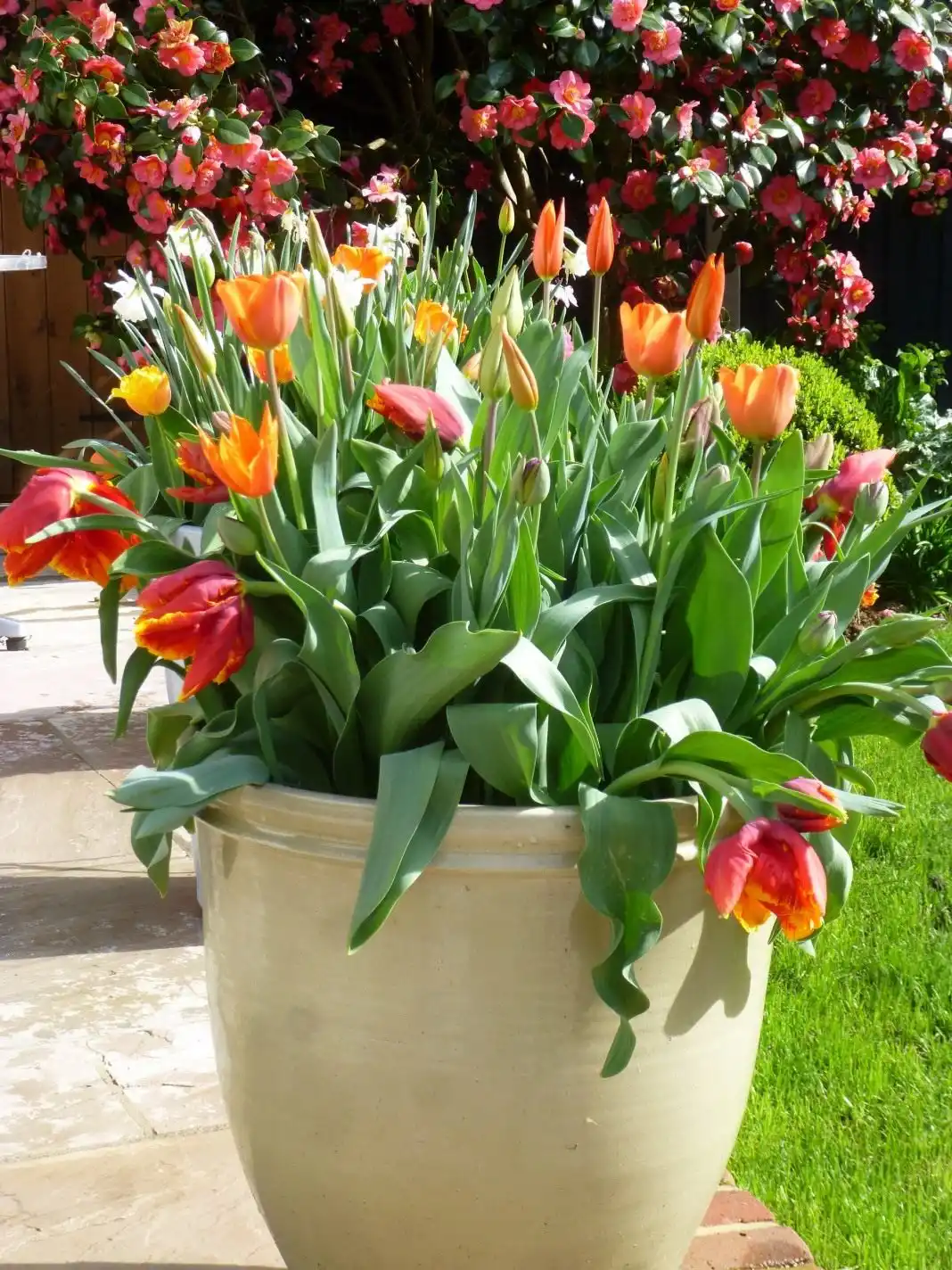 Так само ретельно, як і нарциси, варто обирати тюльпани. Для горшкової форми вирощування підійдуть далеко не всі сорти цих цибулинних, та й самі тюльпани потрібно правильно підкреслити. У горщиках абсолютними лідерами серед різноликих тюльпанів вважають сорти групи Кауфмана. Низькорослі, що починають своє цвітіння ще у березні, вони красуються схожими на яскраві зірки дуже великими квітками. Підійдуть для саду для горщиків і сорту тюльпанів, що випускають на одному квітконосі більше 3-4 квіток, наприклад, ефектний сорт «Praestans Fusilier».