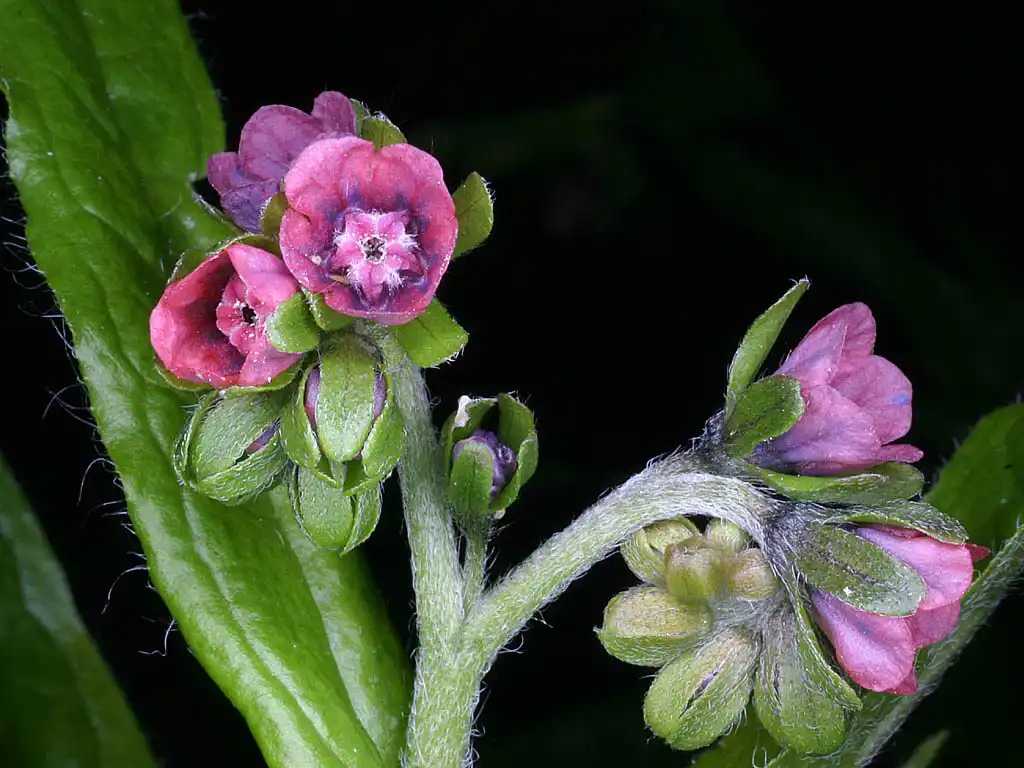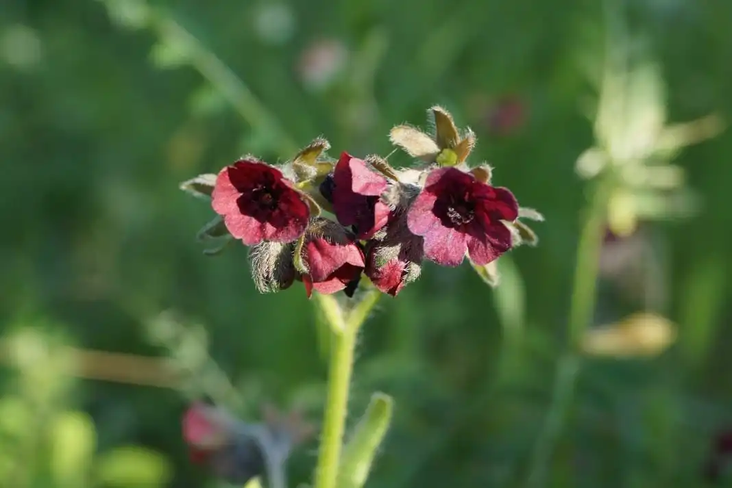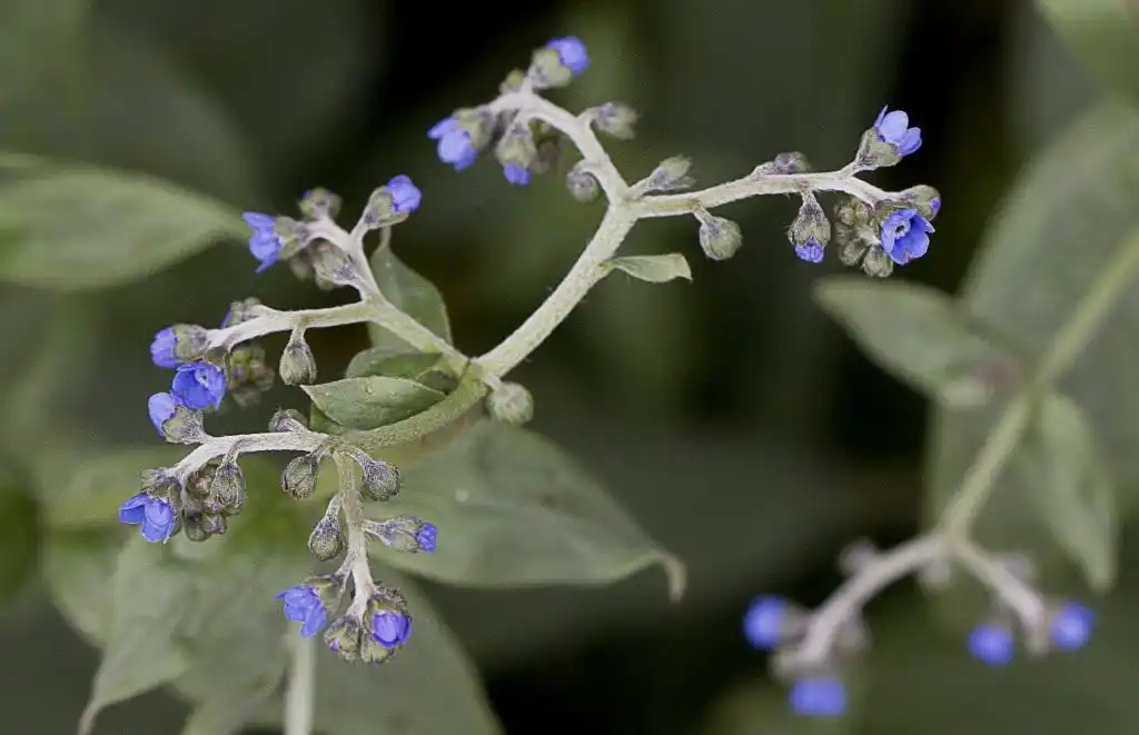 - Чорнокорінь гірський (Cynoglossum montanum) – рослина нижча, з яскравим опушеним листям і ніжними блакитними квітками.