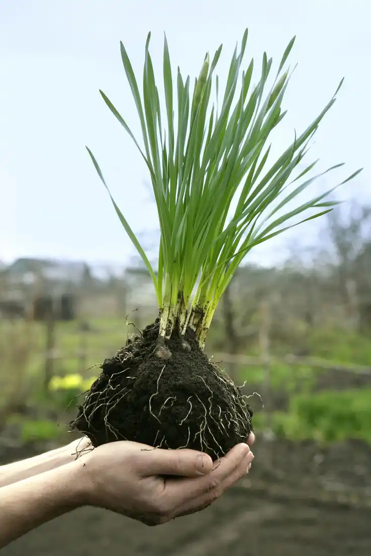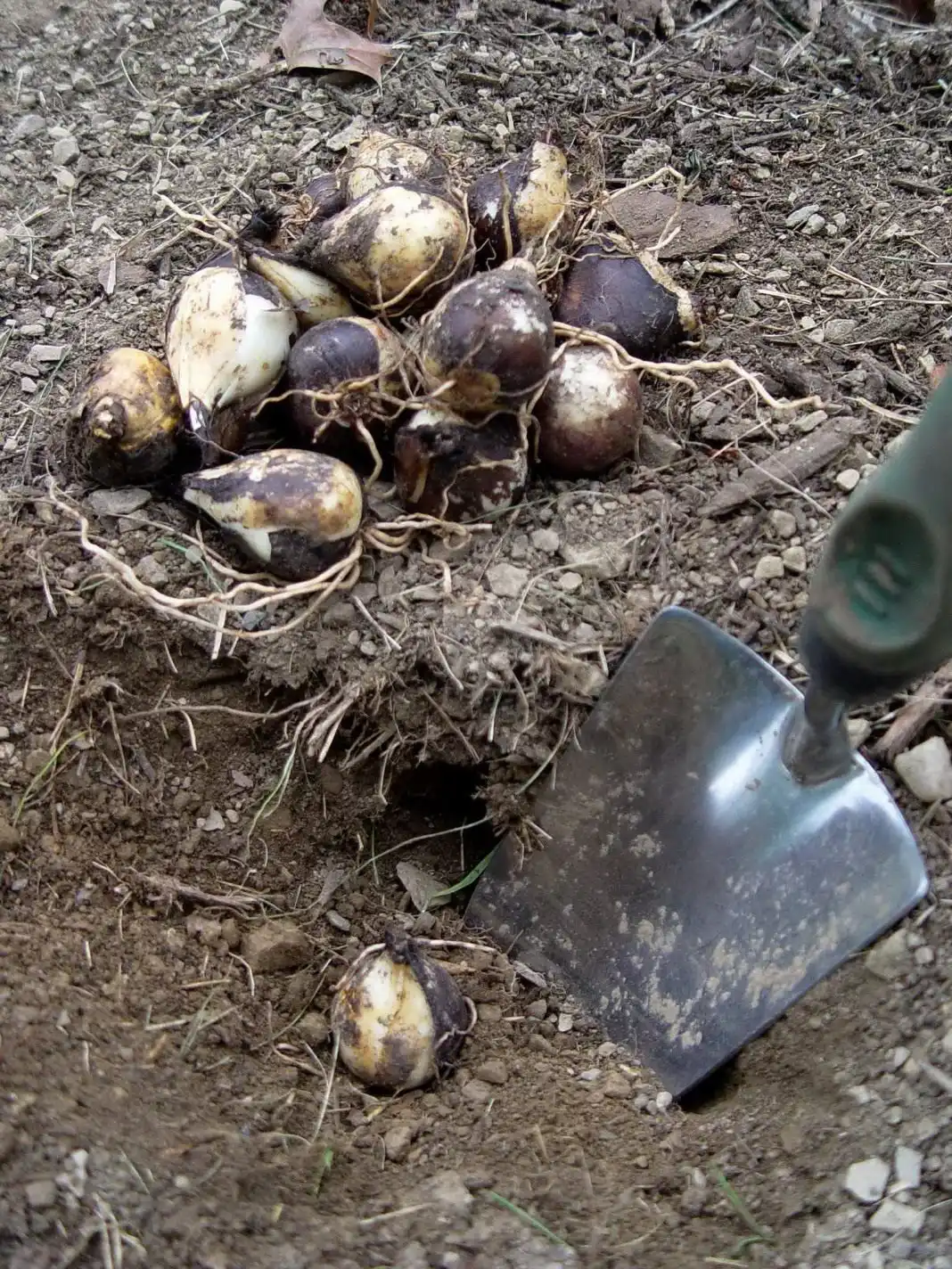 - Якщо ґрунт занадто вологий, щільно сидить на цибулинах, не знімайте субстрат відразу ж після викопування. Безпосередньо після виймання рослини з ґрунту вручну знімають лише легкий, сухий ґрунт. Обстукувати цибулинки не можна.