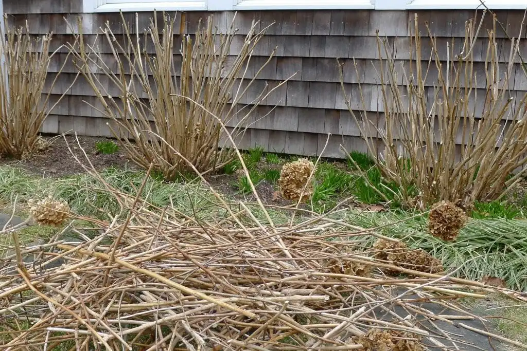 Для гортензій, що потребують зимового укриття, обрізку часто переносять на осінь. Але перед укриттям краще провести лише максимально легке вкорочування пагонів, а повноцінне обрізання повторити навесні.