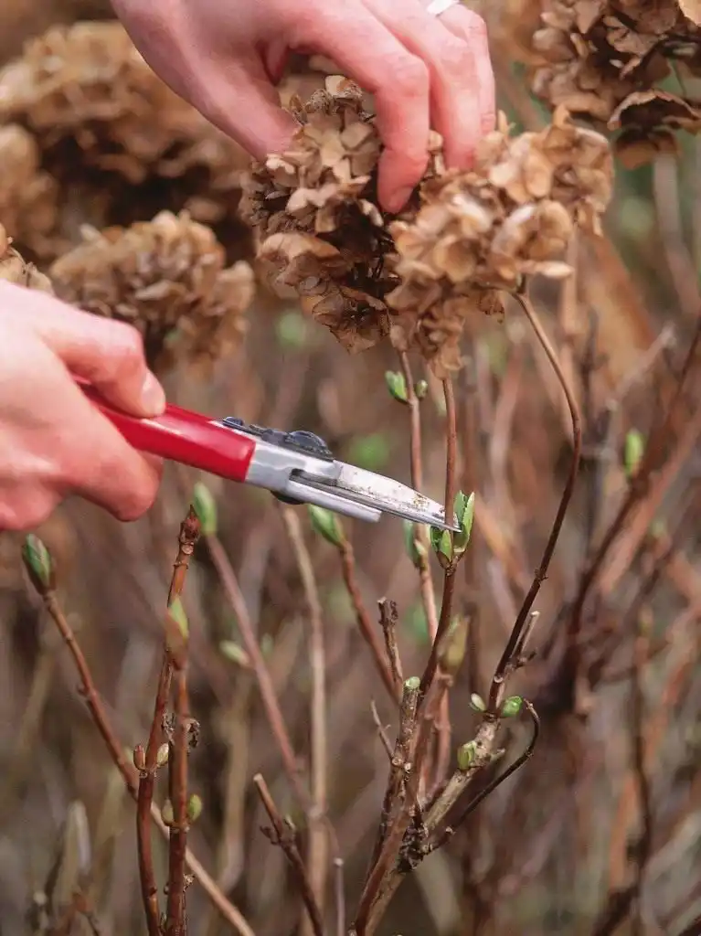Тип і час обрізки гортензій залежать від виду рослини і типу цвітіння. Лише одна з гортензій – чарівна гортензія великолистна (hydrangea macrophylla) – цвіте на торішніх пагонах (точніше, на молодих пагонах, що виросли з верхніх бруньок на торішніх гілках із закладкою квіткових бруньок восени). У неї нирки закладаються на кінцях гілок, і якщо обрізати чагарник за стандартною технікою, рослина зовсім не зацвіте. Обрізка цієї рослини зводиться до санітарного чищення та зрізання минулорічних суцвіть.