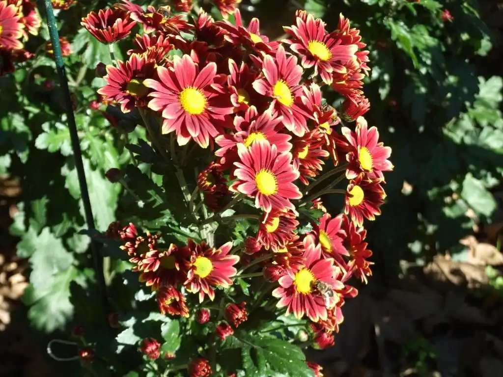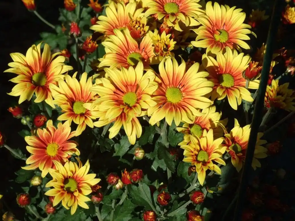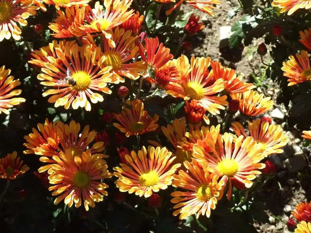 Гірник. Досить оригінальний і через рясне цвітіння, і досить рідкісне цегляне забарвлення суцвіть. Його прості трирядні квіти немов палають на сонці. Особливо ошатно виглядають невигадливі кущики поруч із темнішими сортами дрібноквіткових хризантем.