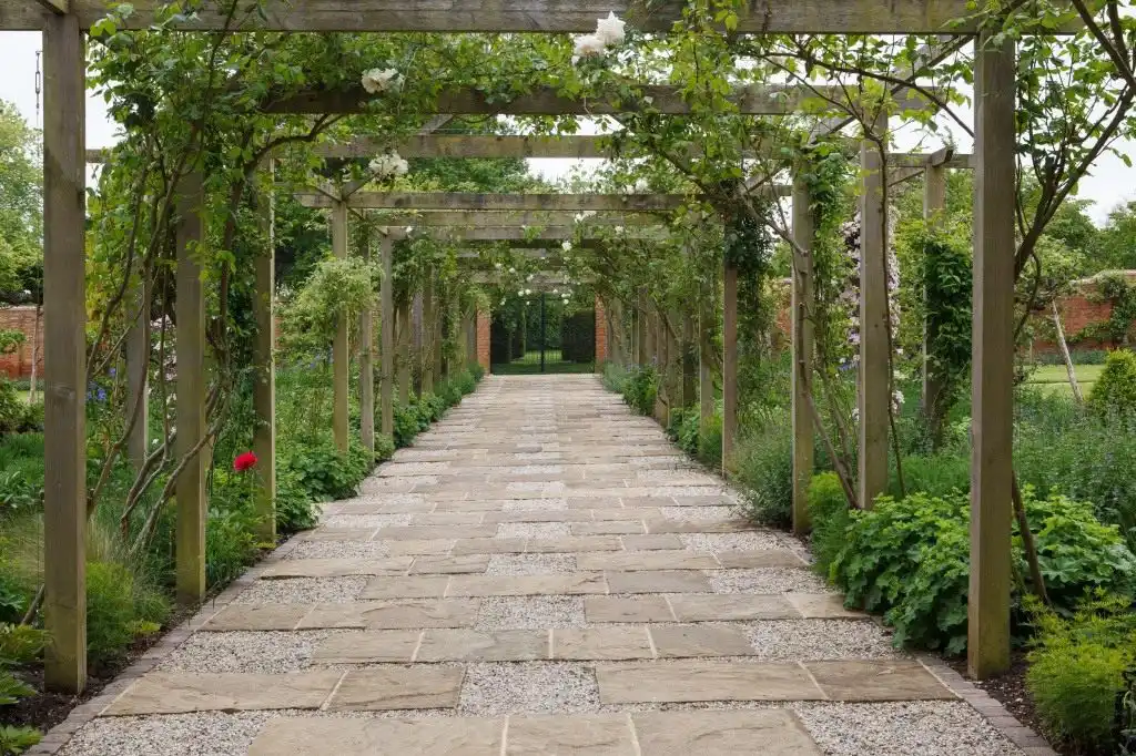 Для того щоб пергола стала ефектним елементом малої архітектури та особливою окрасою під'їзду, не бійтеся використовувати 3-4 різних ліани і висадити під ними якомога пишніші і буйніші, об'ємні зарості багаторічників. А щоб надати виразності, просто розставте акценти за допомогою вічнозелених рослин чи топіаріїв.
