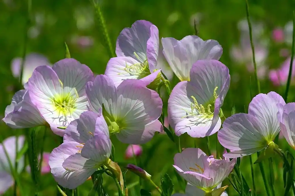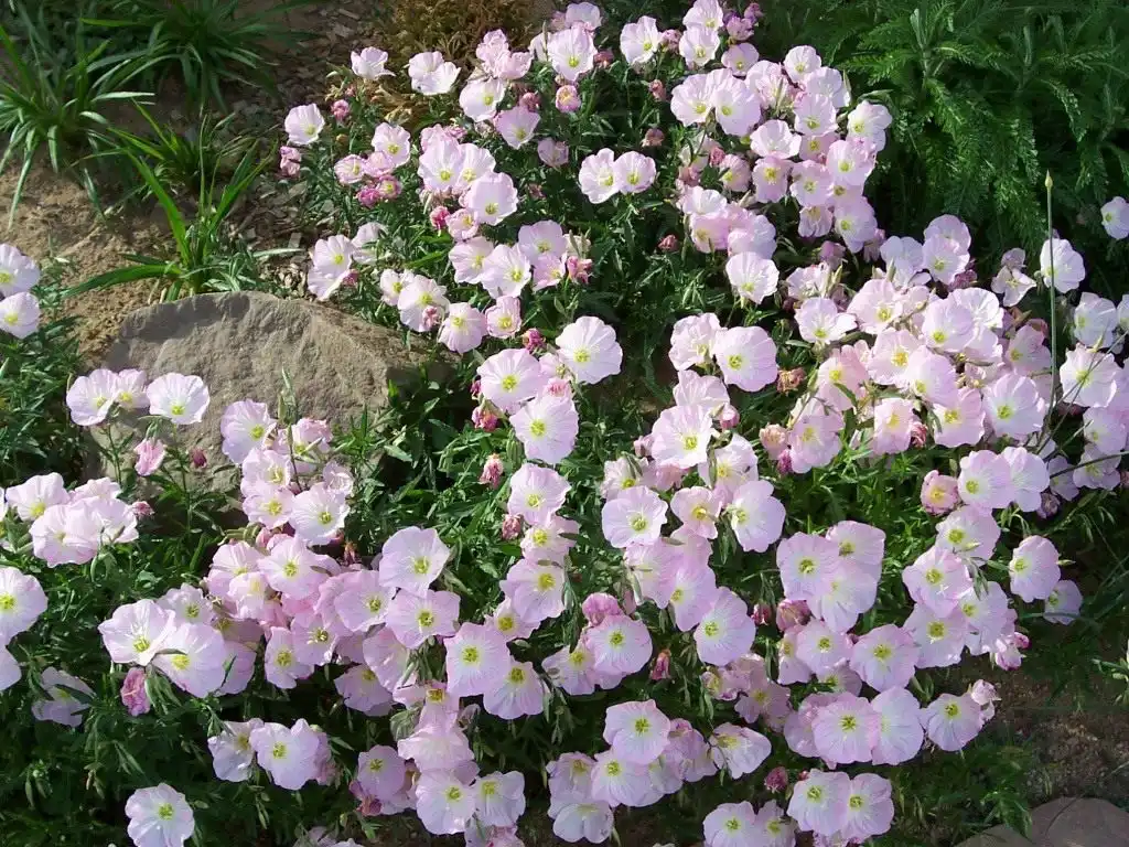 Енотера гарна (Oenothera speciosa) швидко вироджується, але напрочуд ефектна. Її довгасте листя разом з гнучкими пагонами створює ажурну подушку, на якій масово розпускаються чашоподібні біло-рожеві суцвіття, ніби вкриваючи кущики покривалом. Її на зиму зберігають із викопуванням із ґрунту або вирощують у контейнерах.