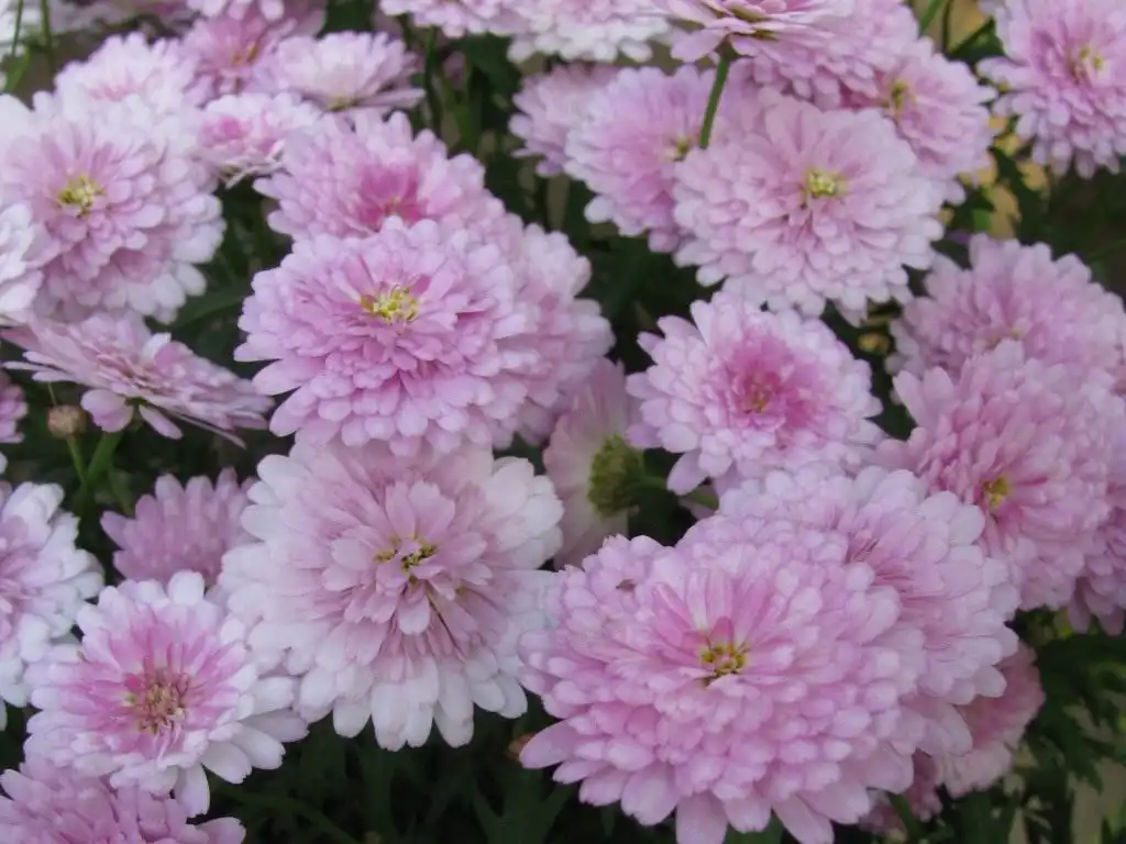 - сорт ‘Sweetyвисотою близько 70 см з дуже яскравою, що майже кричить зеленню і світло-рожевими суцвіттями, у яких є додаткова прикраса у вигляді білого кільця навколо жовтих трубчастих квіток у центрі кошиків;