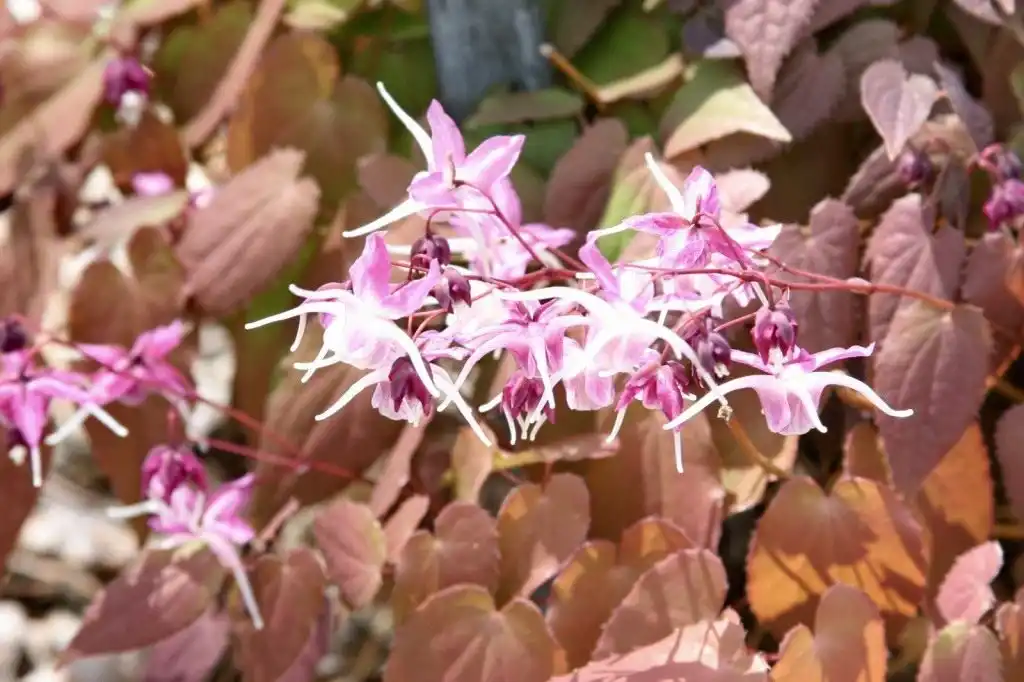 - такий же низькорослий, але повільно зростаючий епімедіум пишний з перистими, бронзуватими і поступово зеленіючими листками, що звисають білими або ліловими квітками, які розпускаються на самому початку весни (потребує світлого місця або півтіні);