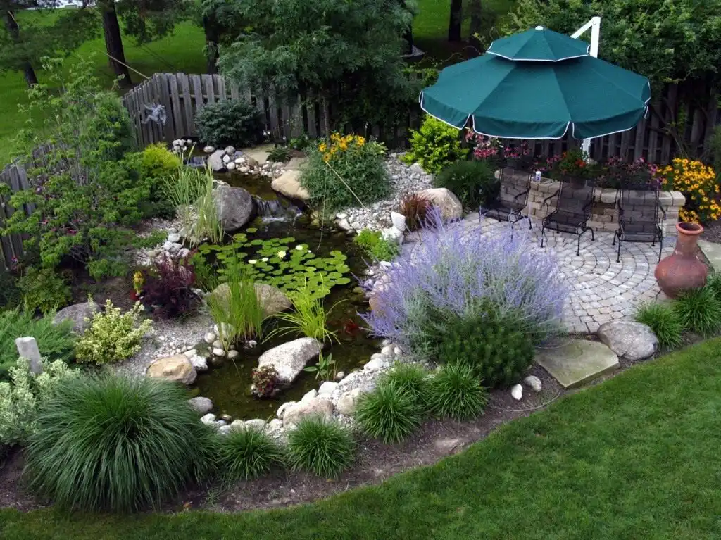 Розташовуючи зони відпочинку і плануючи невеликий город або інші об'єкти з обмеженою функціональністю, постарайтеся розмістити їх так, щоб вони виступали «противагами» до самої водойми, розташовувалися в протилежному боці саду по діагоналях (за цим принципом краще розмістити меблі на терасі).