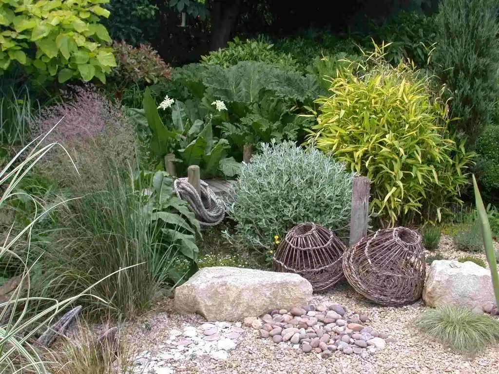 У такому саду чудово виглядатимуть найвиразніші і текстурні рослини від величних хост і музичних злаків до повітряної манжетки, невтомного барвінку, химерних гейхер, що сяють у компанії синьобарвних рослин дорогоцінними металами культур із сріблястим листям — чистця, полину та пр.