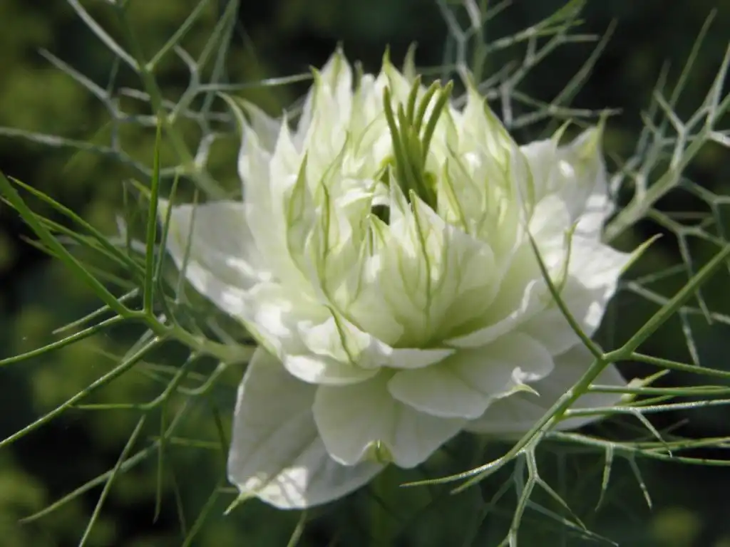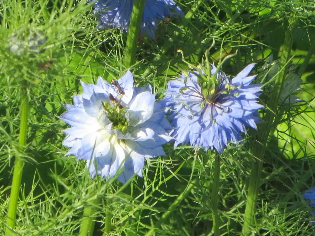 - Нігелла дамаська (Nigella damascena) – рослина висотою до 35-45 см з незвичайними білими, синіми та небесно-блакитними квітками в оточенні декоративного перисто-розсіченого листя.