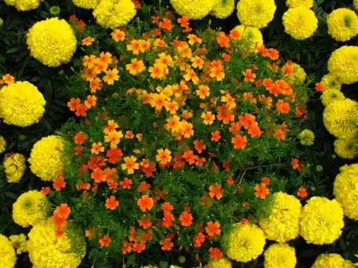 Сорта чорнобривців багатоквіткових - Tagetes erecta та Tagetes patula. Рослини до І м заввишки, у них махрові квіти.