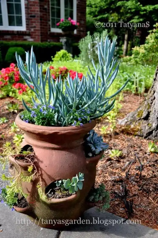 Основна рослина тут - 'Блакитні пальчики' чудового сріблясто-блакитного кольору (Senecio mandraliscae Blue Fingers), що росте вертикально. Мені цей колір дуже подобається. Просто зачаровує…